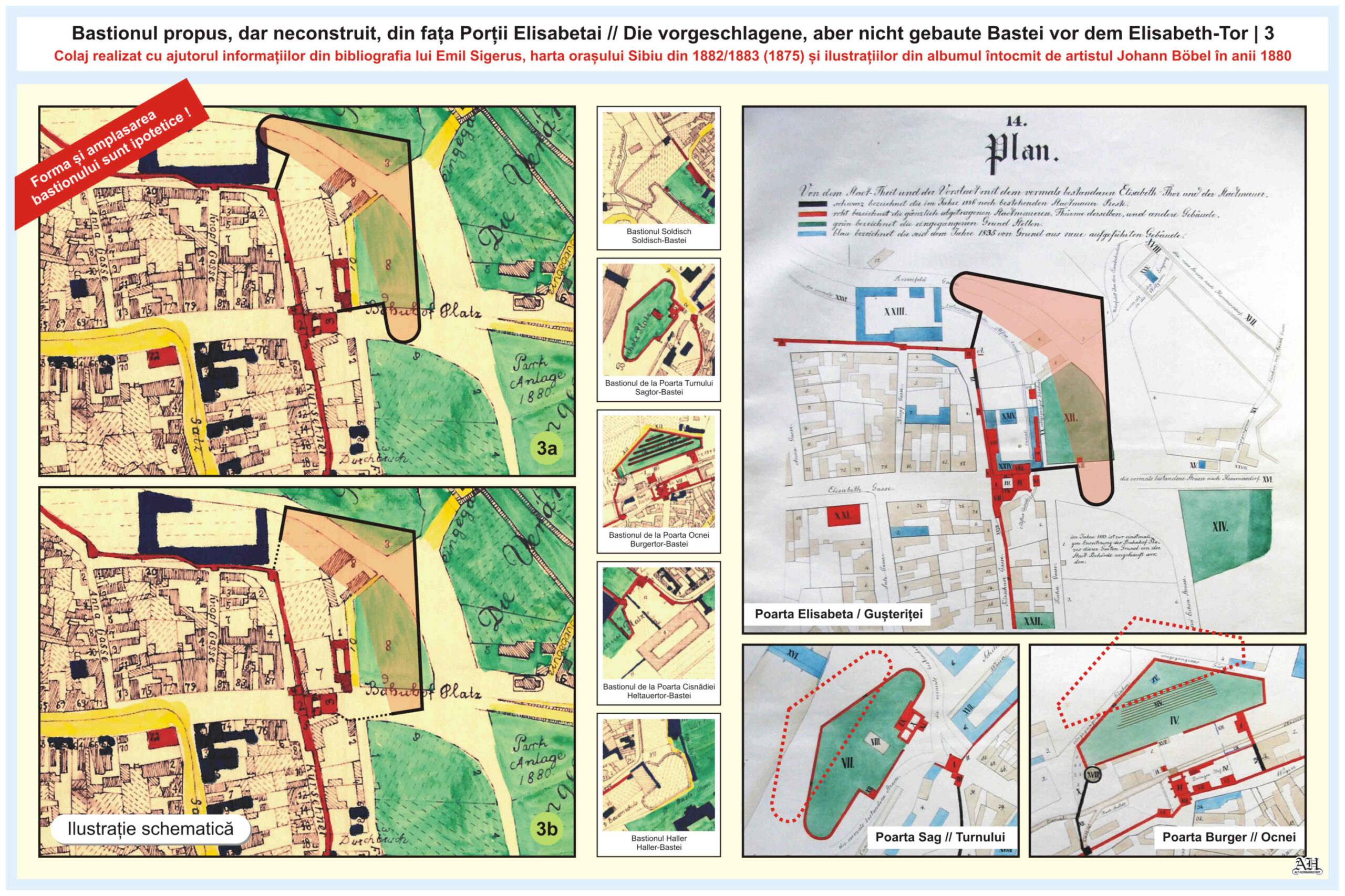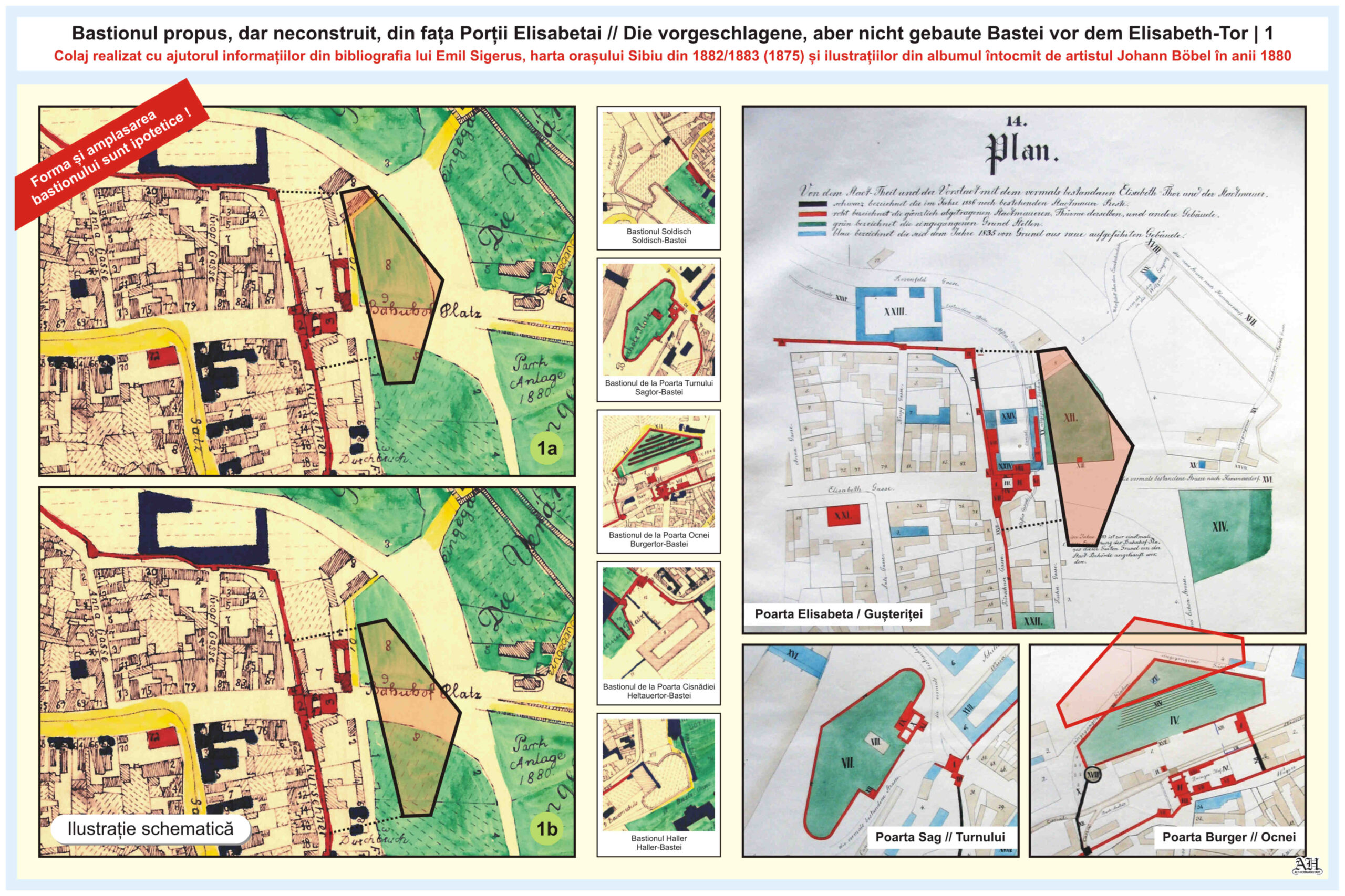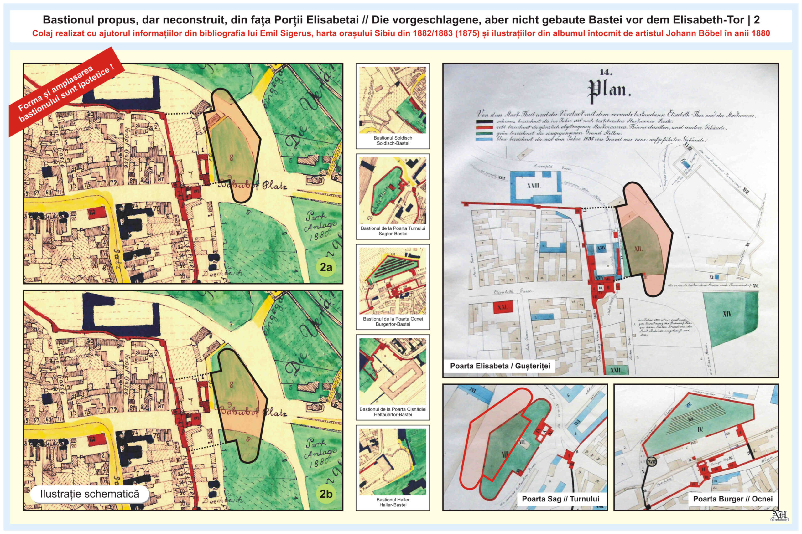 Din păcate, nu există ( nu se cunosc ) informații, planuri sau desene cu privire la forma sau amplasarea bastionul planificat în fața Porții Elisabeta. Cu ajutorul informațiilor din bibliografia lui Sigerus, planșelor și hărții orașului Sibiu, completat cu informații grafice și texte de Johann Böbel ( 1824-1887 ) în 1882-1883, vom încerca să „reconstruim” și să poziționăm un „bastion ipotetic” în fața Porții Elizabeta!