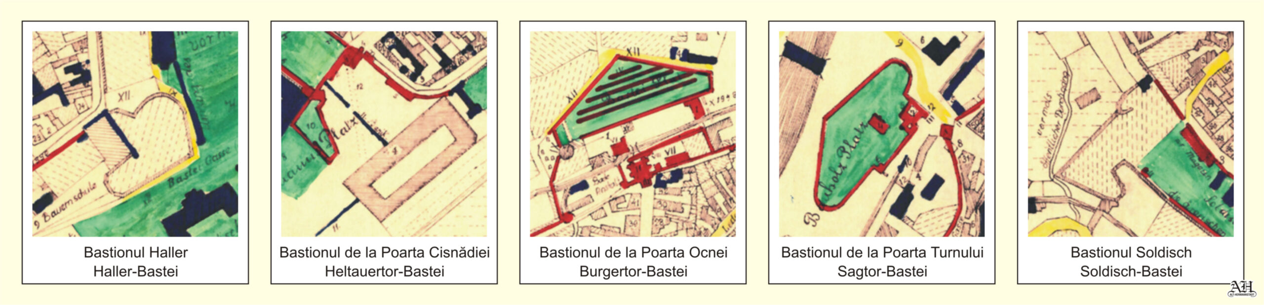 Bastioanele orașului Sibiu, construite în a doua jumătate a secolului al XVII-lea și prima jumătate a secolului al XVIII-lea. Detalii din Planul orașului Sibiu tipărit în 1875 la Institutul litografic Friedrich August Robert Krabs din Sibiu și completat de Johann Böbel ( 1824-1887 ) cu informații grafice și texte în 1882-1883.