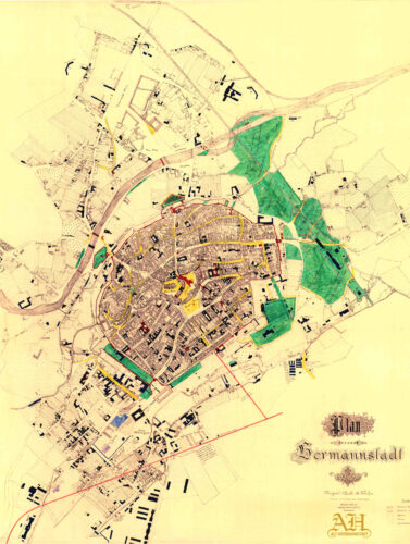 Stânga: Detaliu din Planul orașului Sibiu din 1875, bazat pe un desen al gravorului Franz J. Dimitrowits, a fost tipărit la Institutul litografic Friedrich August Robert Krabs din Sibiu, Piața Mare 13. Este primul plan al orașului Sibiu realizat pe baza principiilor topomrtrice moderne!