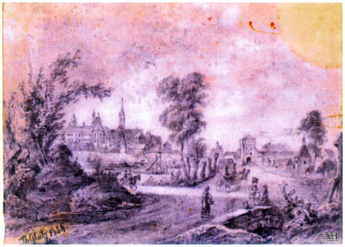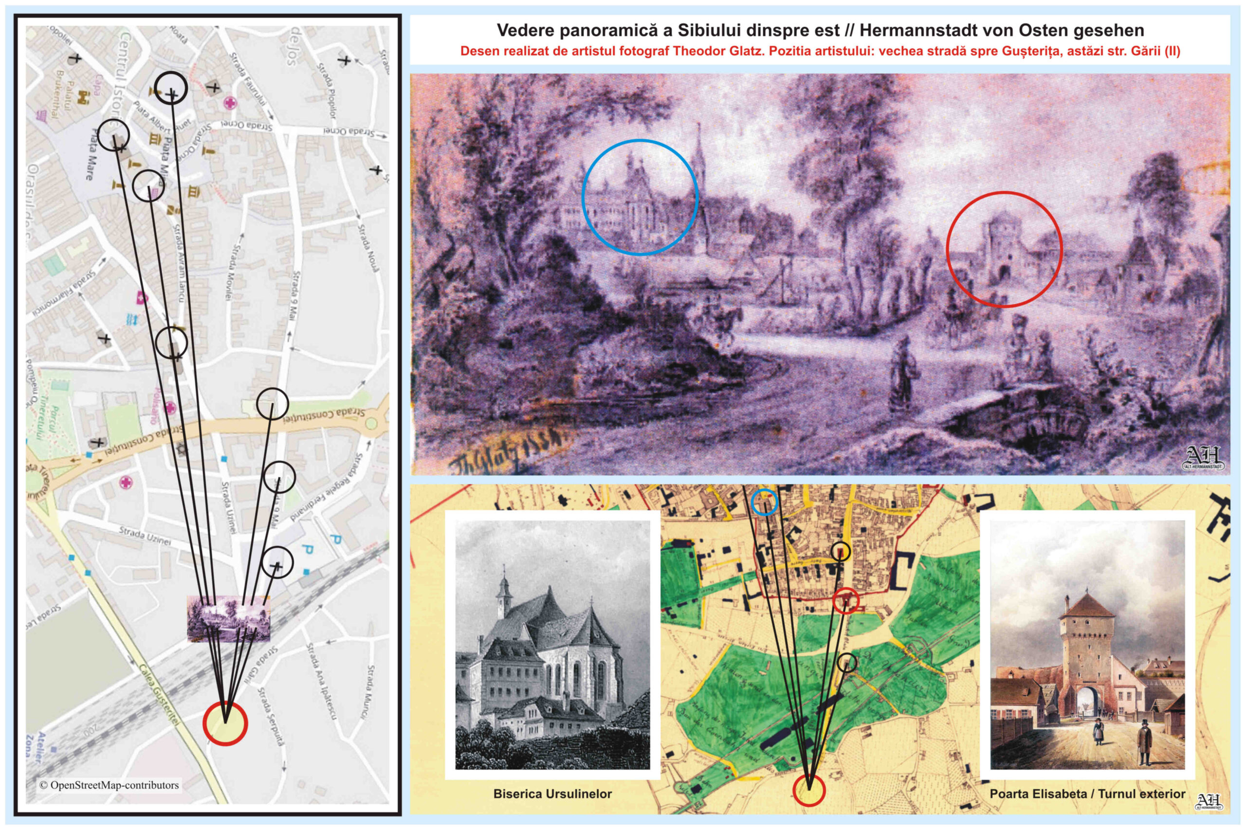 Acest desen în creion, 17,6 x 23,8, a fost realizat de artistul fotograf Theodor Glatz în 1854. Cadrul imaginii corespunde vederii din actuala piață a gării, mai prcis din vechea stradă spre Gușterița, astăzi str. Gării. În dreapta se află Poarta Elisabeta, demolată în 1865, în sttânga acesteia se vede Biserica Elisabeta, demolată în 1868, iar în dreapta se află Capela Sfânta Cruce. Sub veduta cunoscută a orașului vechi cu bisericile din orașul de sus se întinde zidul centurii de fortificații ( demolat în anii 1860 ). În fața zidului se văd grădinile administrate de măiereni. Tinerele măierene au fost unul dintre motivele preferate ale fotografului Theodor Glatz. Fotocredit: Konrad Klein.