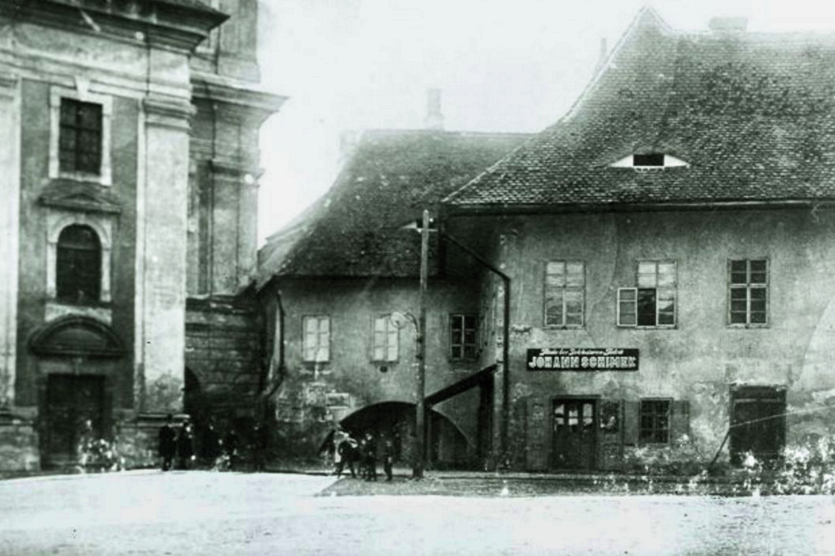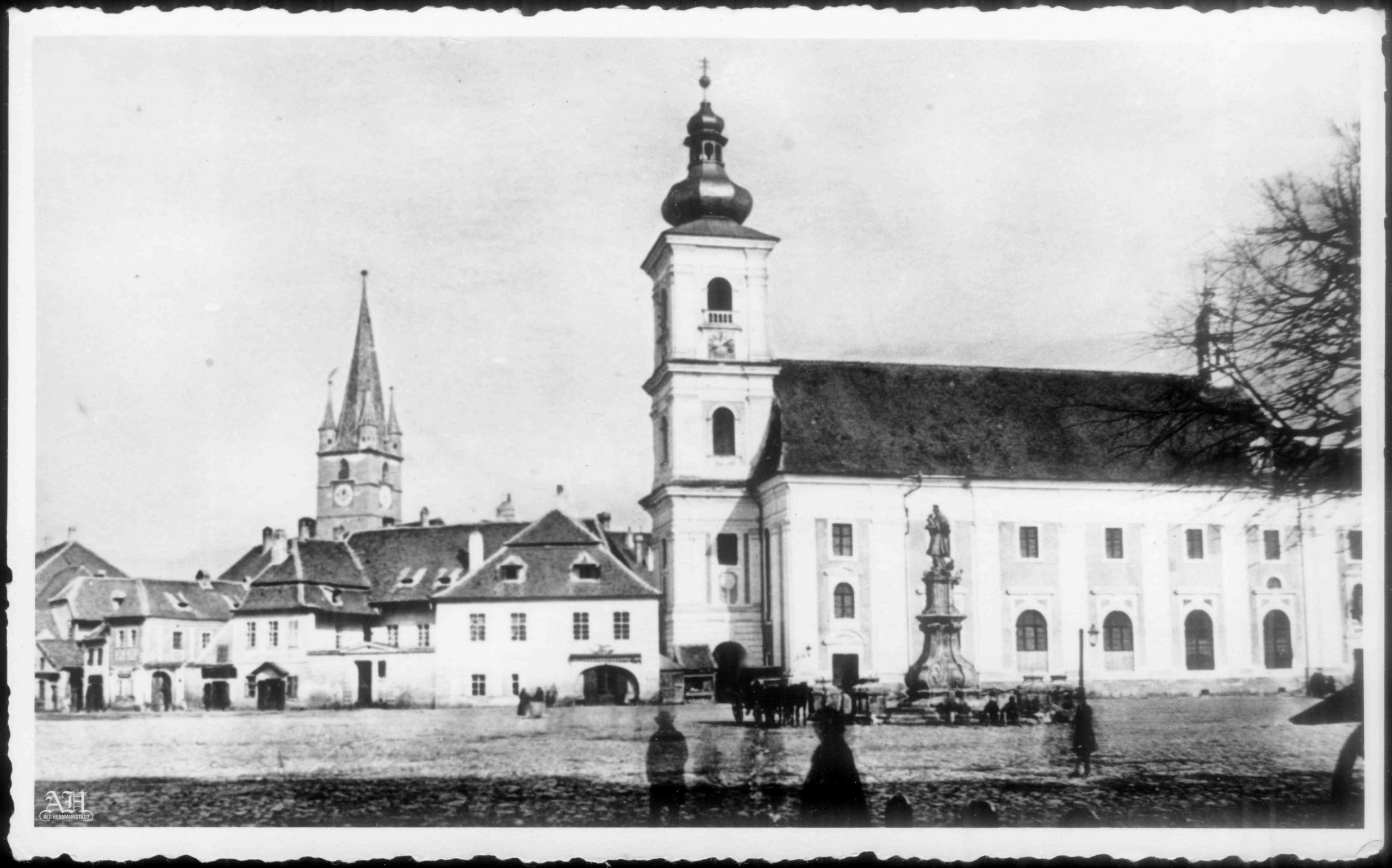 Fotografie din atelierul lui Theodor Glatz. Lângă turnul Bisericii Catolice se vede clădirea de la nr. 3, în care se afla farmacia La Vulturul Negru // Zum Schwarzen Adler.