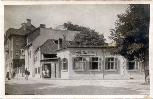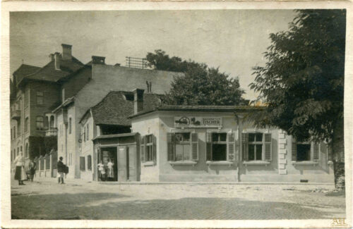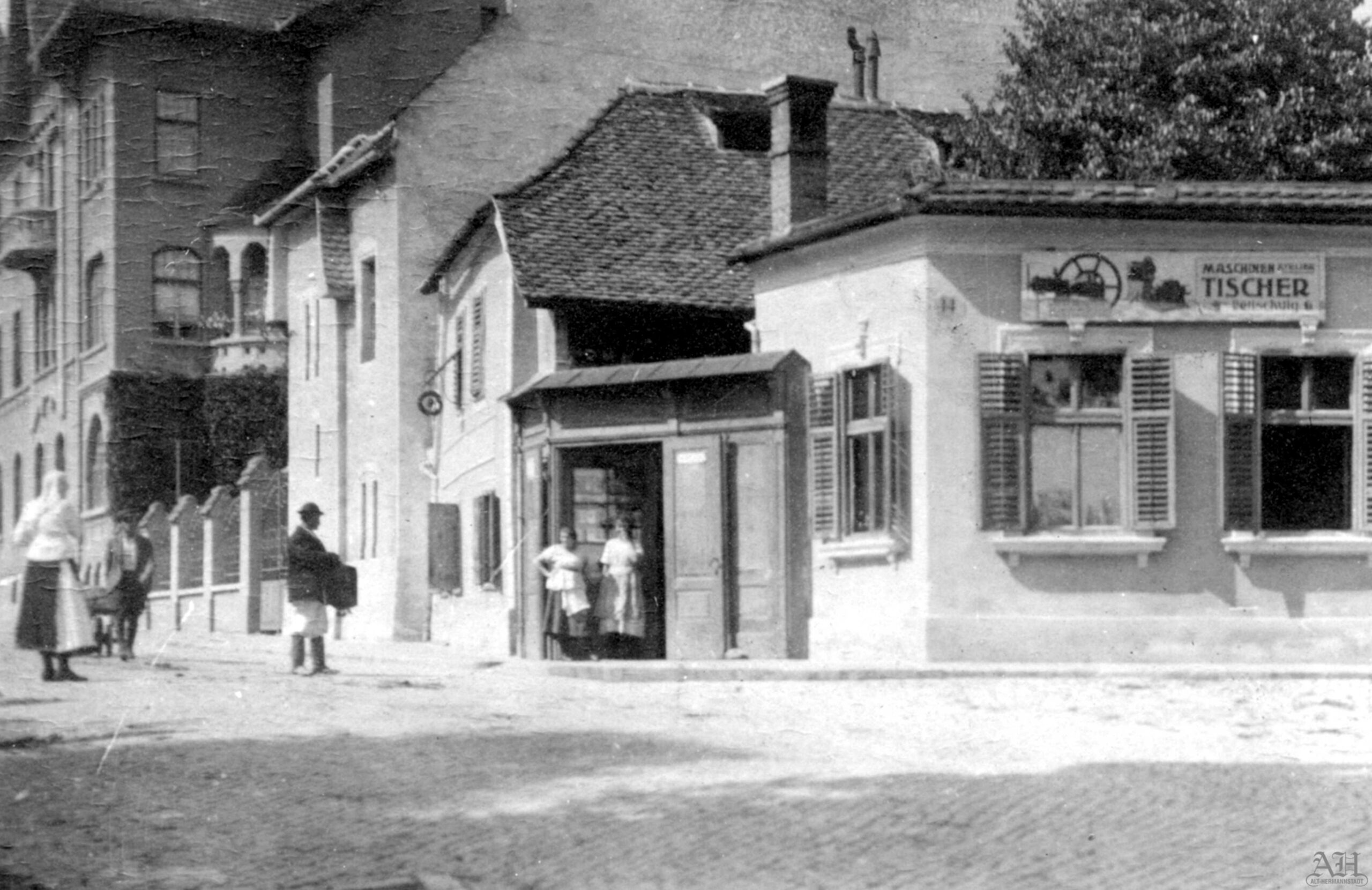 Carte poștală ilustrată din perioada interbelică. În fotografie apare clădirea, str. Pompeiu Onofreiu // Hallergasse nr.9 din Sibiu, în care a fucționat cârciuma familiei Köschut din 1838 până prin anii 1920 când a fost preluată de Rudolf Binder. Cărciuma se afla lângă casa cu reclama TISCHER, str. Manejului // Reitschulgasse nr.12. Casa de colț se afla în perioada respectivă în proprietatea lui Karl Tischer, care avea un atelier mecanic pe strada Manejului nr.4. Cartea poștală se află în colecția privată Wolff.