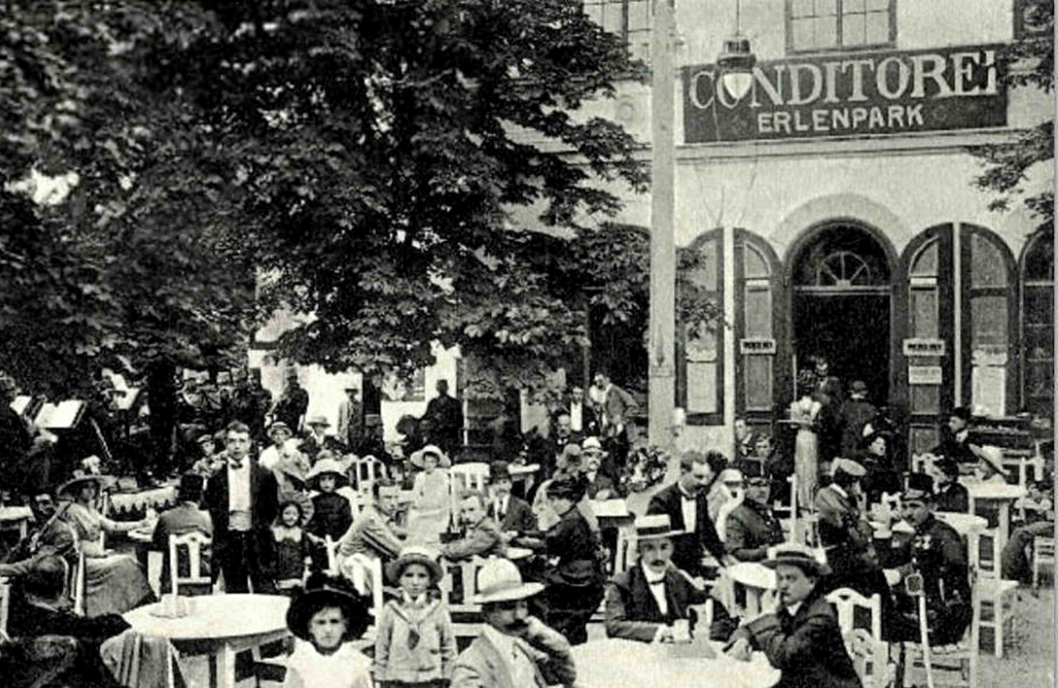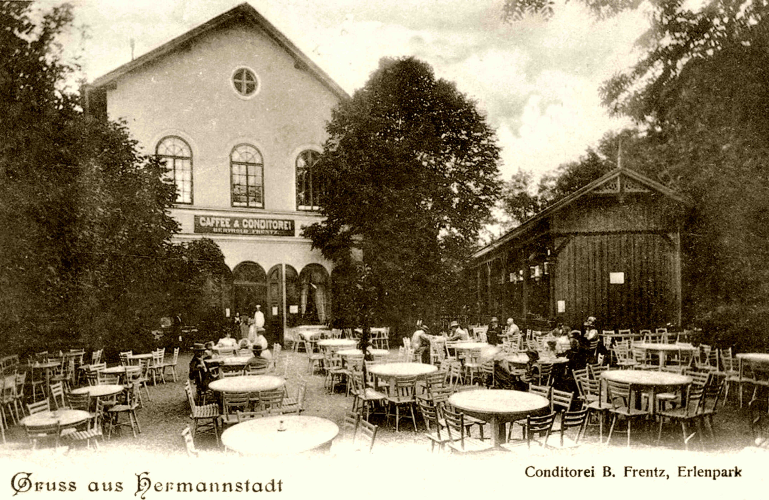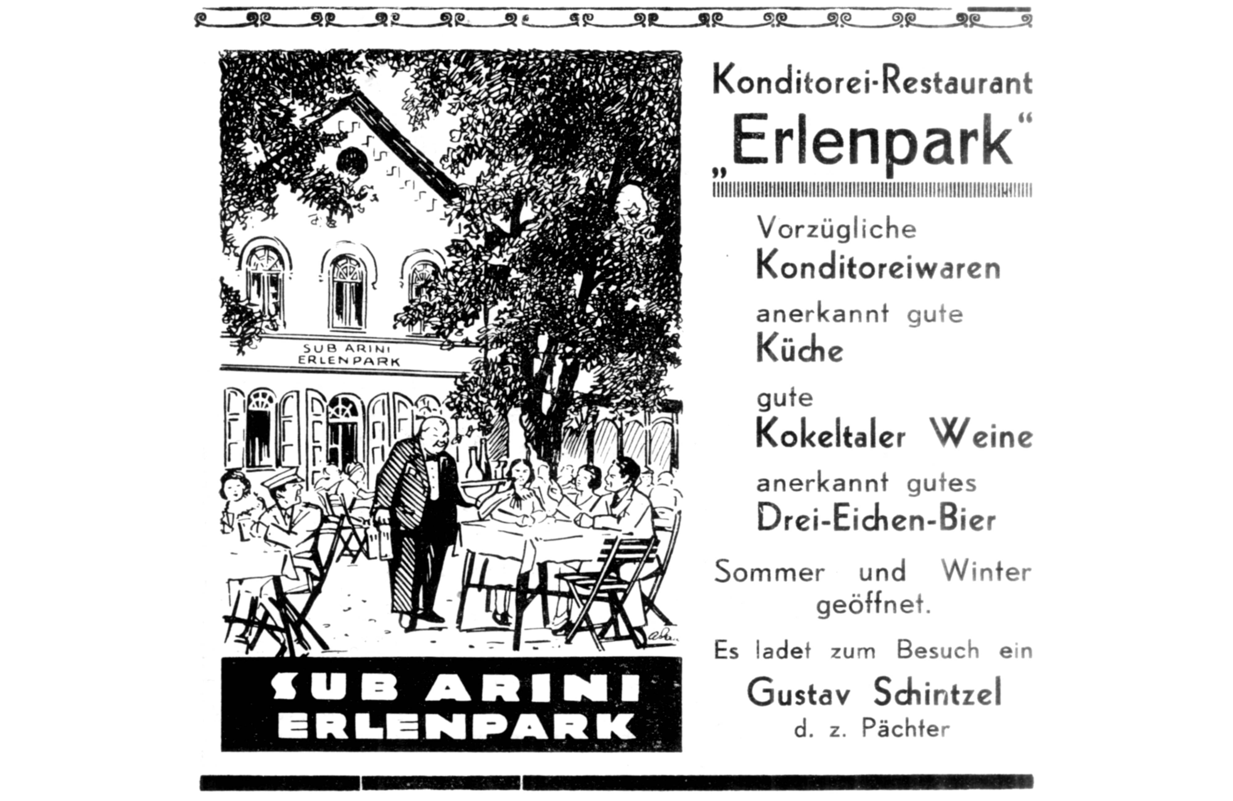 În 1934, comerciantul Gustav Schintzel a luat în chirie spațiul comercial de la parterul clădirii din Sub Arini unde a deschis cofetăria cu restaurant, SUB ARINI // ERLENPARK, care a funcționat acolo până la izbucnirea celui de-al Doilea Război Mondial.