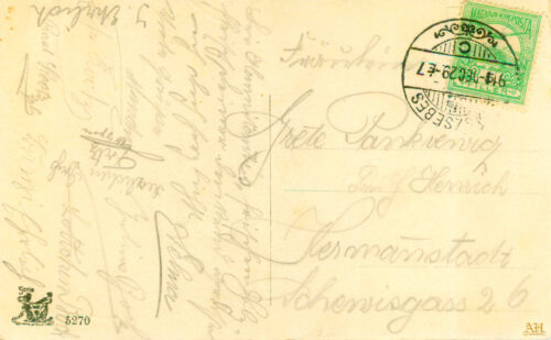 Cartea poștală este inscripționată pe față cu textul „Glückliches Neujahr”. Pe verso se află adresa destinatarei, „Freulein Grete Pankiewicz, bei h. Heinrich, Hermannstadt Schewisgasse 26”, precum și urări de Anul Nou din partea Selmei și a prietenelor sale.