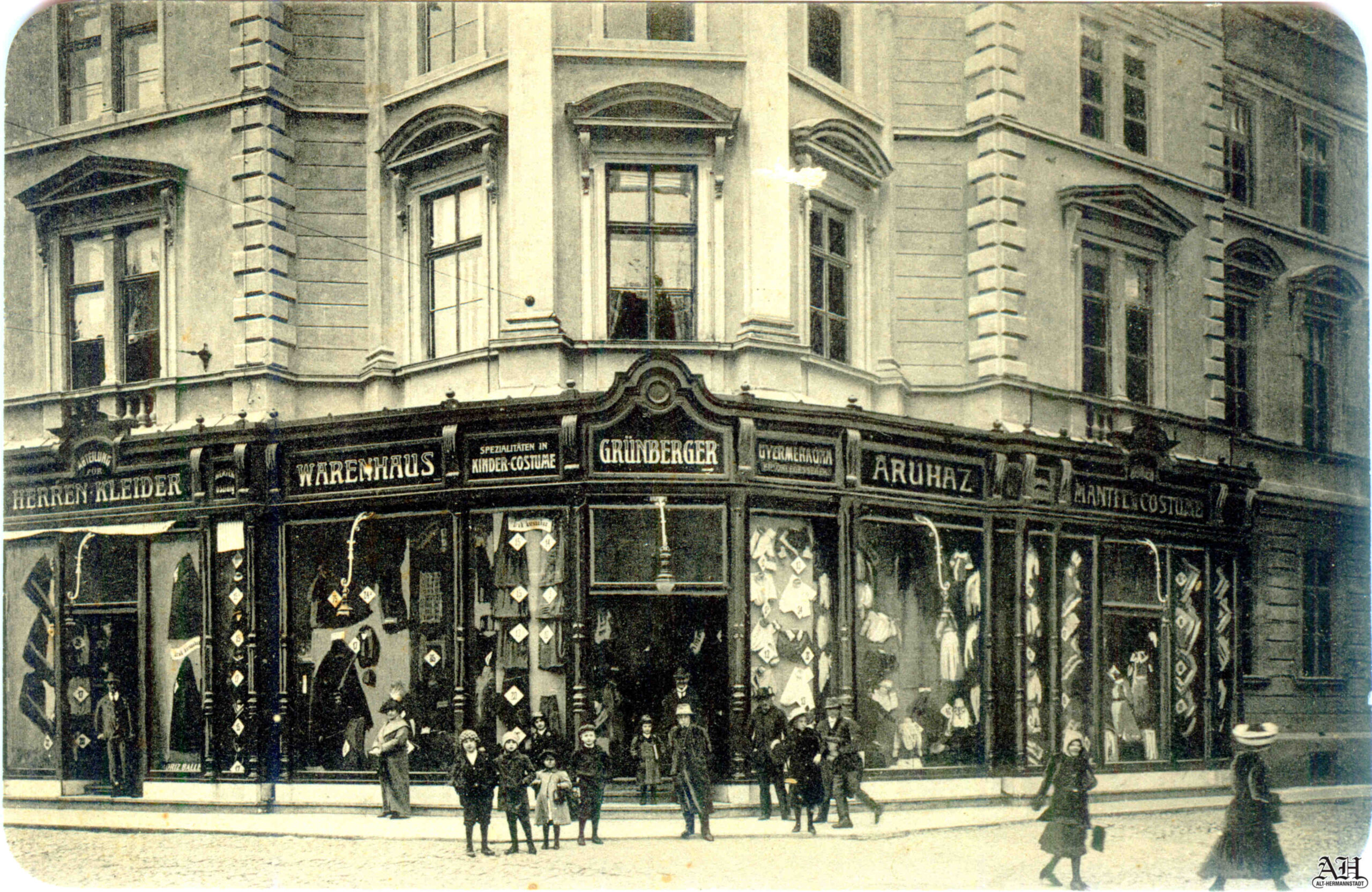 Magazinul de confecții „WARENHAUS – GRÜNBERGER – ÁRÚHÁZA” se afla la parterul clădirii situată pe strada Nicolae Bălcescu, ( germană, Heltauergasse | ungurește, Disznody Utcza ), colț cu strada Xenopol, ( fosta ulița Balului // Ballgasse ). Clădirea a fost construită în anul 1892 pentru Comandamentul corpului de armată 12 cezaro-crăiesc, ( Korpskommando des 12. k. u. k. Armee-Korps ), pe locul unde se afla anterior vechiul hotel „Împaratul Romanilor” // Hotel zum Römischer Kaiser. În perioada anilor 1970-1980, se afla la parterul clădirii Agenția de Voiaj CFR.