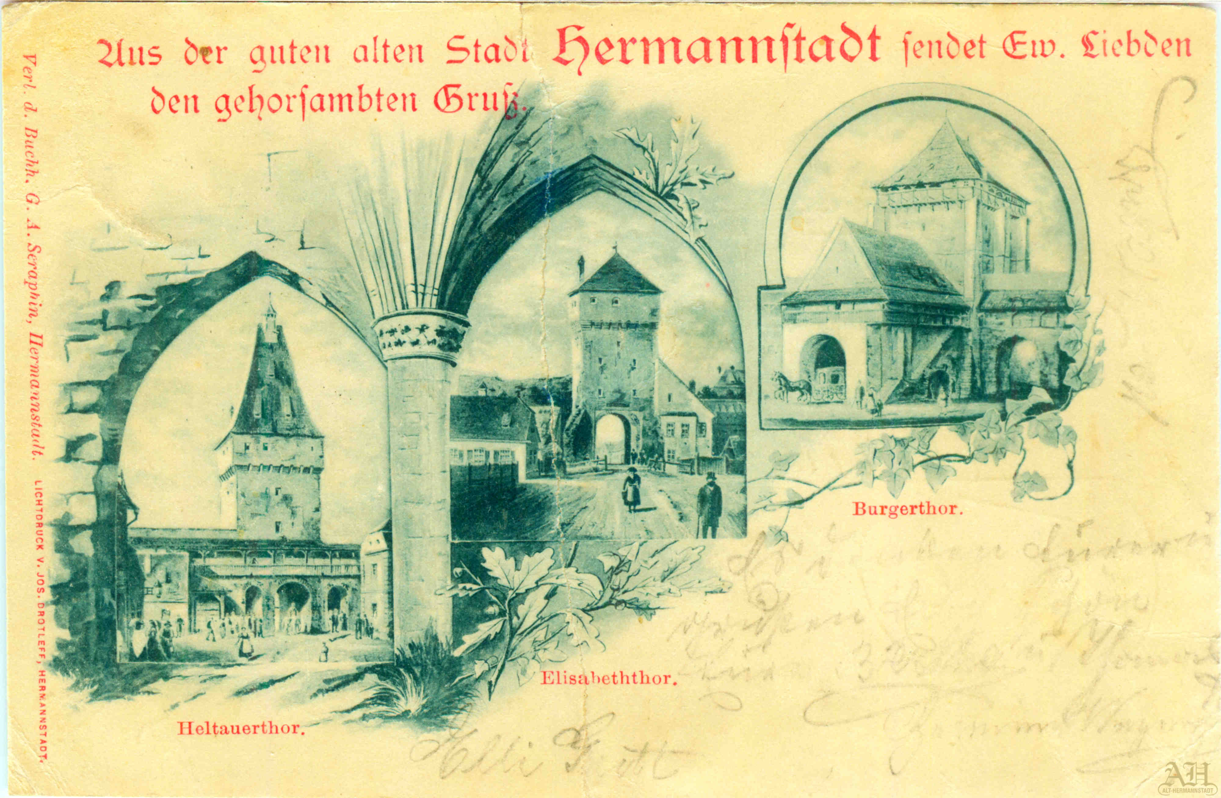 Această frumoasă carte poştală ilustrată, circulată în 1899, a fost realizată în tehnica litografiei fotocromatice la sfârșitul ultimului deceniu al secolului al XIX-lea. Cartea poștală cu „salutări din vechiul oraș Sibiu” a fost tipărită la tipografia sibiană Josef Drotleff și lansată la editura librăriei G.A. Seraphin din Sibiu. Ilustrația este etichetată cu textul, „Aus der guten alten Stadt Hermannstadt sendet Ew.(*) Liebden den gehorsambten Gruß ~ Verl. d. Buchh. G.A. Seraphin, Hermannstadt, Lichtdruck v. Jos. Drotleff, Hermannstadt.” // „Din bunul și vechiul oraș Sibiu, trimit dragilor mei cele mai sincere salutări.” – „Editura librăriei G.A. Seraphin, Sibiu, tipărit de Jos. Drotleff, Sibiu.”