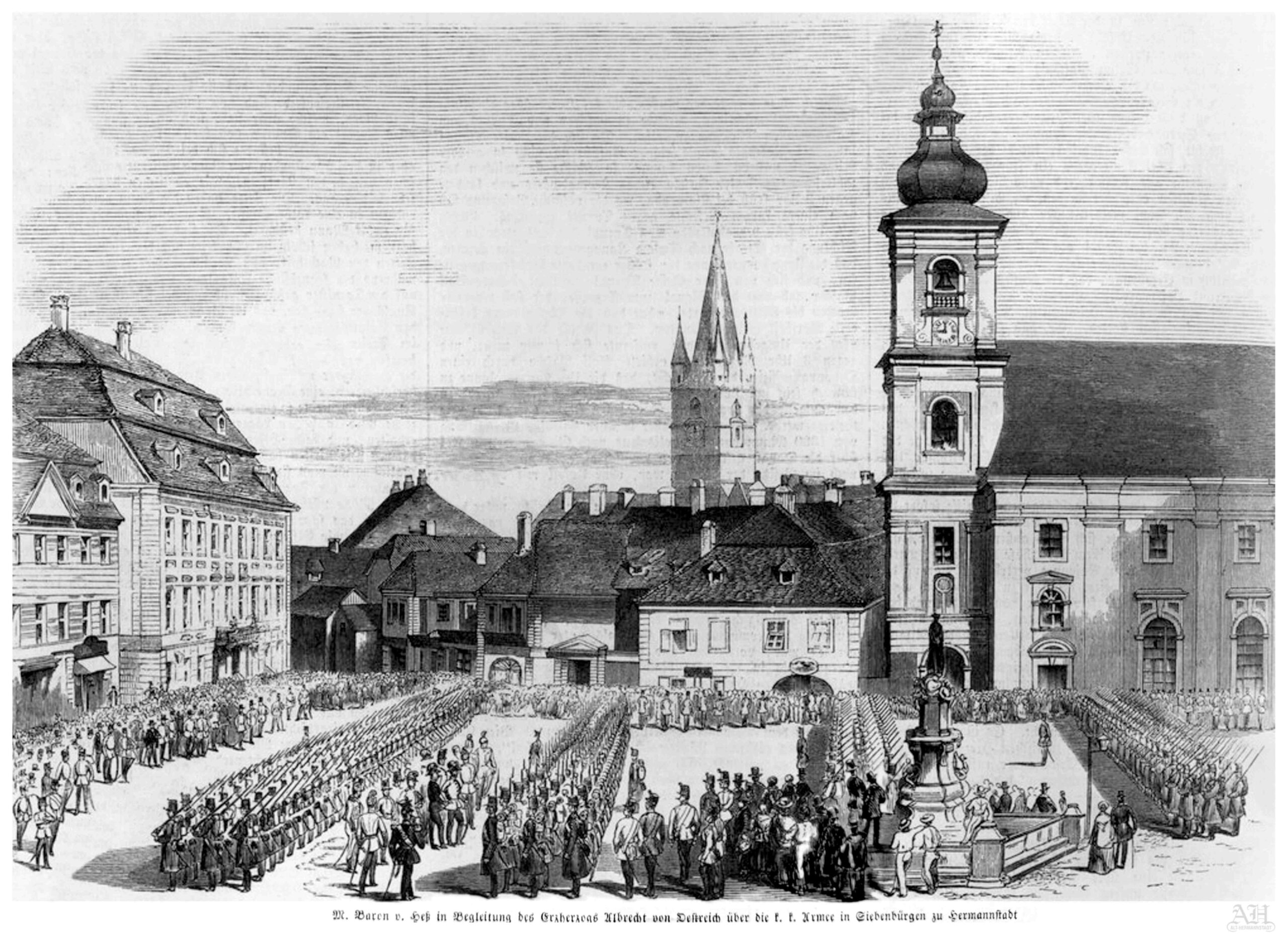 Această frumoasă xilogravură prezintă Trecerea în revistă militară de către Ofițerul de campanie baronul von Heß, însoțit de arhiducele Albrecht al Austriei, a armatei imperiale și regale din Transilvania în Piața Mare din Sibiu la 10 iulie 1854. Ilustrația a fost publicată în ziarul Illustrierte Zeitung din Leipzig la 5 august 1854.