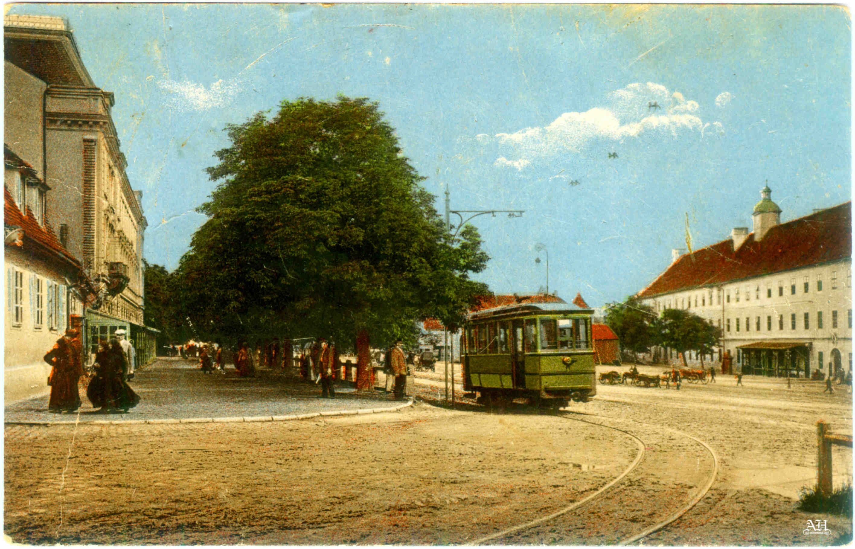 Sibiu – Piața Hermannsplatz // Piața Unirii la începutul sec. al XX-lea (după introducerea tramvaiului 1905). În partea stângă Palatul Habermann și Promenada Bretter, în partea dreaptă Cazarma cezaro-crăiască de Infanterie / Cazarma 90. (Carte poștală circulată 1914)
