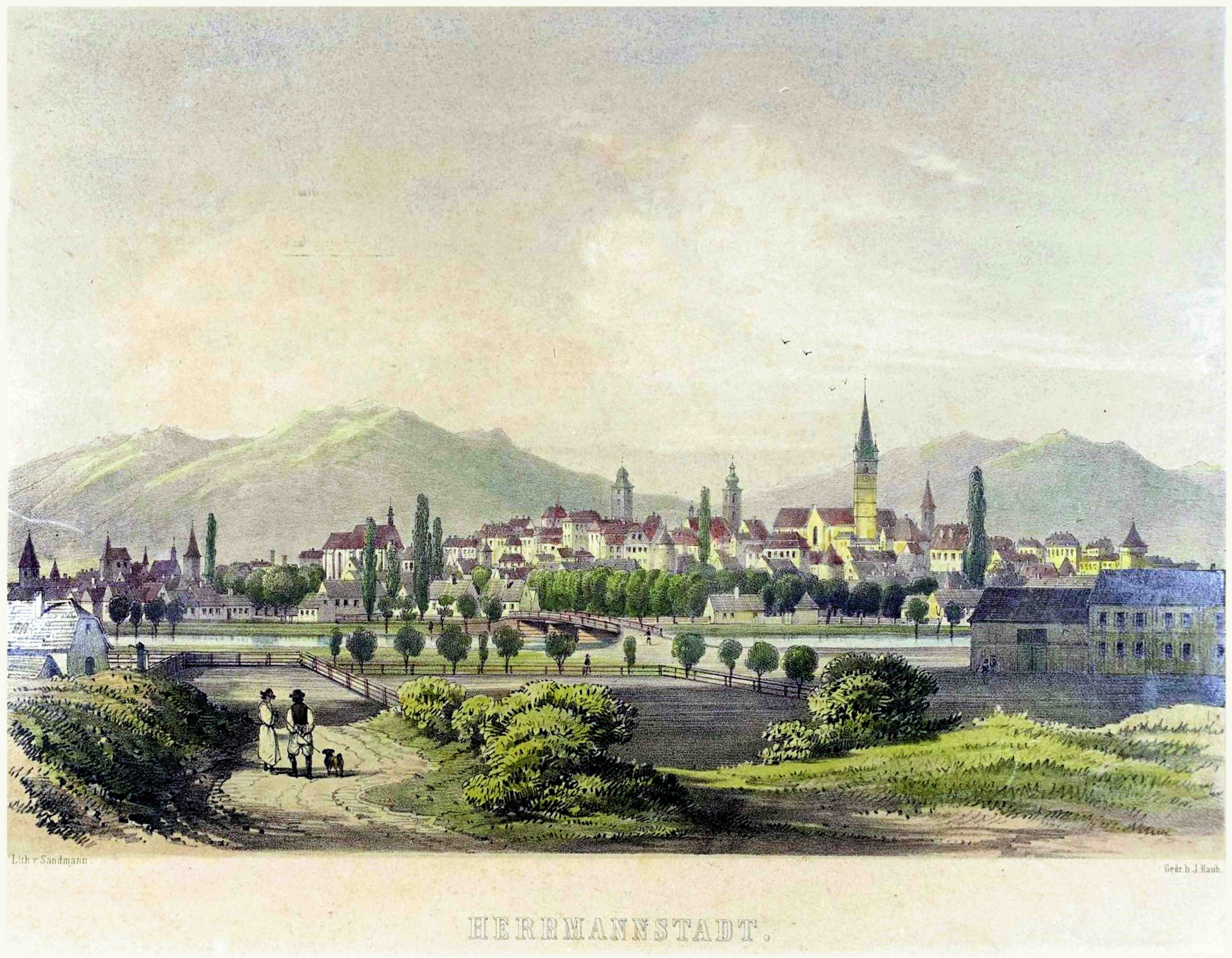 Ilustrația este inscripționată cu următorul text: „Hermannstadt | Lith. v. Sandmann | Gedr. b. J. Rauh” ( Sbiu – Litografie tipărită de Franz Xaver Josef Sandmann la Institutul Litografic Johann Rauh din Viena. )