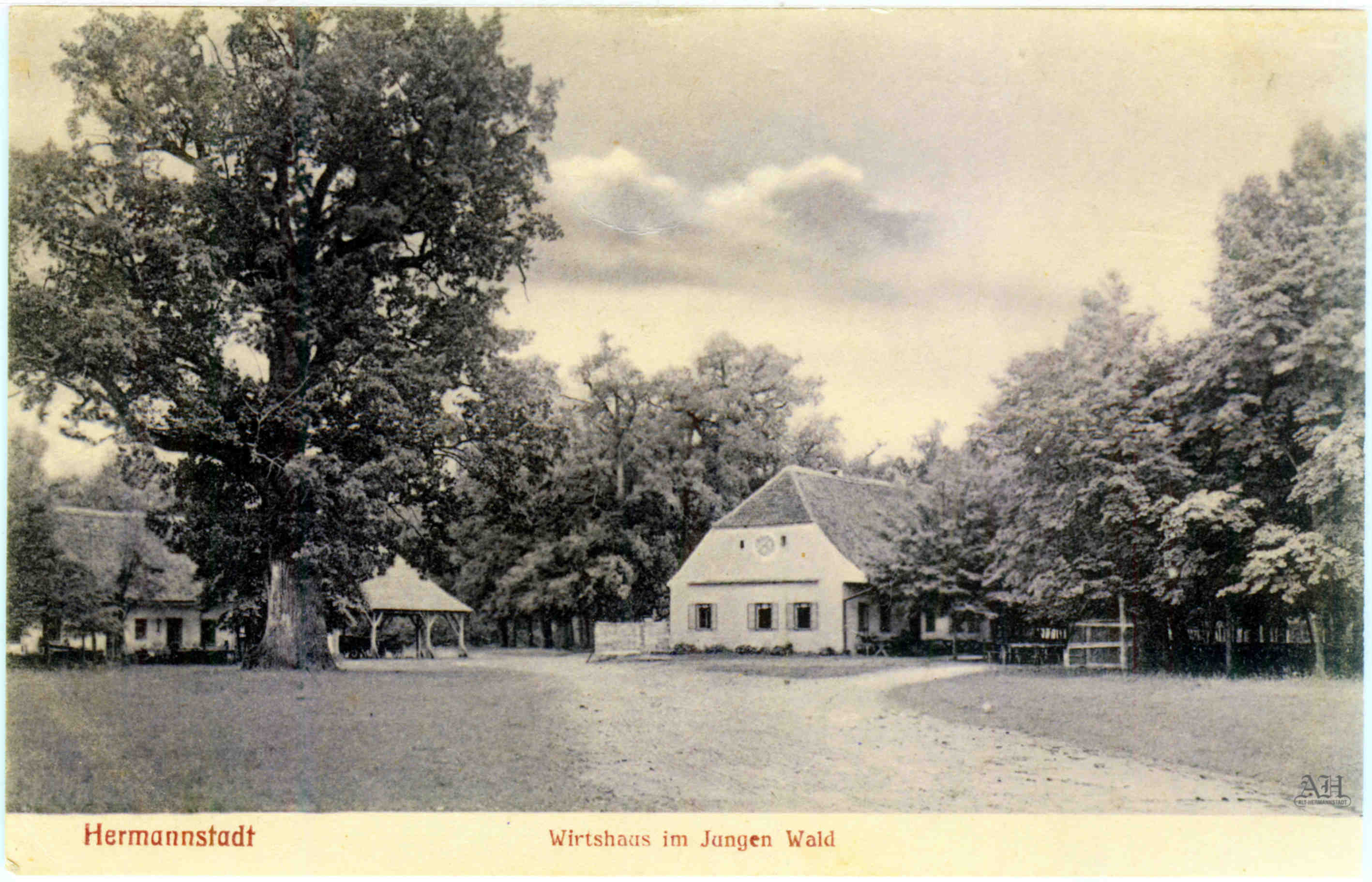 Carte poștală tip LEVELEZÖ-LAP circulată 1910, realizată la editura și librăria G. A. Seraphin din Sibiu (Verl. d. Buchh. G. A. Seraphin, Hermannstadt) tipărită la tipografia Jos. Drotleff din Sibiu. Carte poștală din colecția personală. Clădirea noului han din Pădurea Dumbrava (Sibiului) // Junger Wald a fost construită la începutul celui de al doilea deceniu al secolului al XX-lea, după planurile arhitectului sibian Ludwig Orendt (1876-1930).