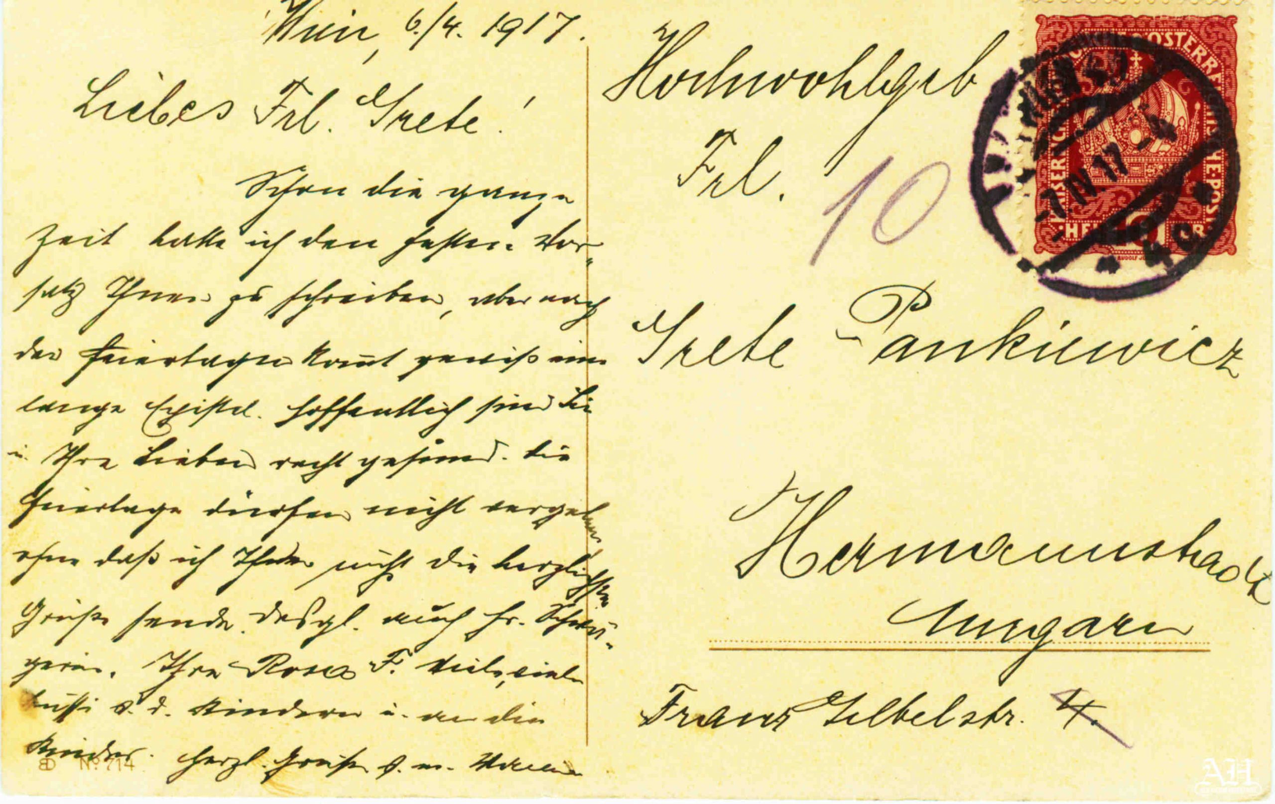 Cartea poștală cu urări de Paști 1917 a circulat la data de 6/7 aprilie între Viena și Sibiu. Urările de sfântă sărbătoare a Învierii Domnului au fost adresate domnișoarei Grete Pankiewicz, domiciliată în Sibiu, str. Spartacus // Franz Gebbel Strasse nr. 10.