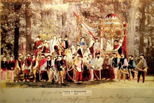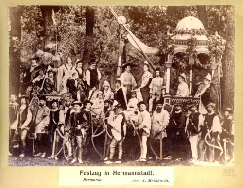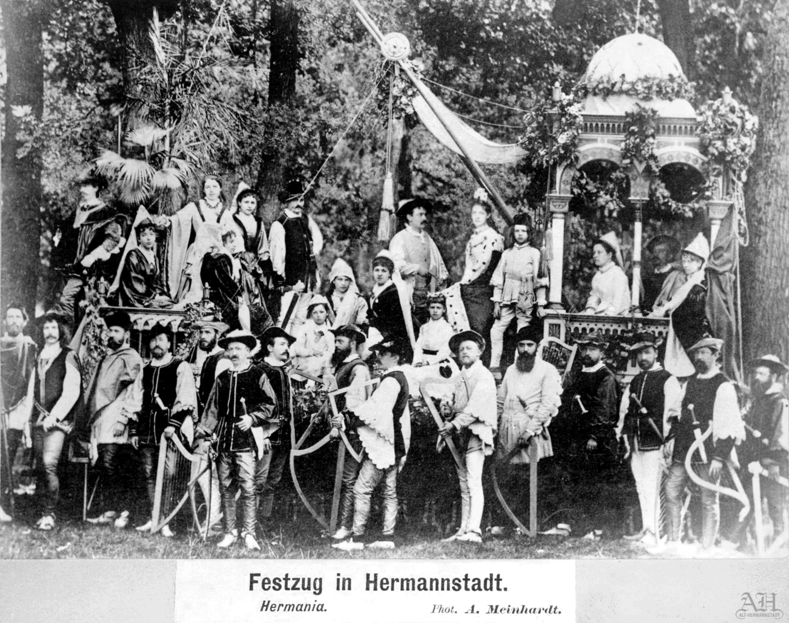 Această fotografie documentară a fost realizată în 1884 de fotograful August Salomon Meinhardt ( 1845-1900 ). Fotografia, care înfățișează carul alegoric „Hermania” și un grup de muzicieni în costume de menestreli și personaje de basm, face parte din seria de fotografii documentare, „Festzug in Hermannstadt”, ( Alai de sărbătoare din Sibiu ) pe care fotograful August Meinhardt a realizat-o în timpul celebrării a 700 de ani de la imigraria sașilor în Transilvania. Parada istorică și festivalul folcloric în pădurea Dumbrava Sibiului, ( Jungenwald ), au fost organizate cu ocazia zilelor Associației, ( Vereinstage ), desfășurate pe 24 august 1884 în Sibiu.