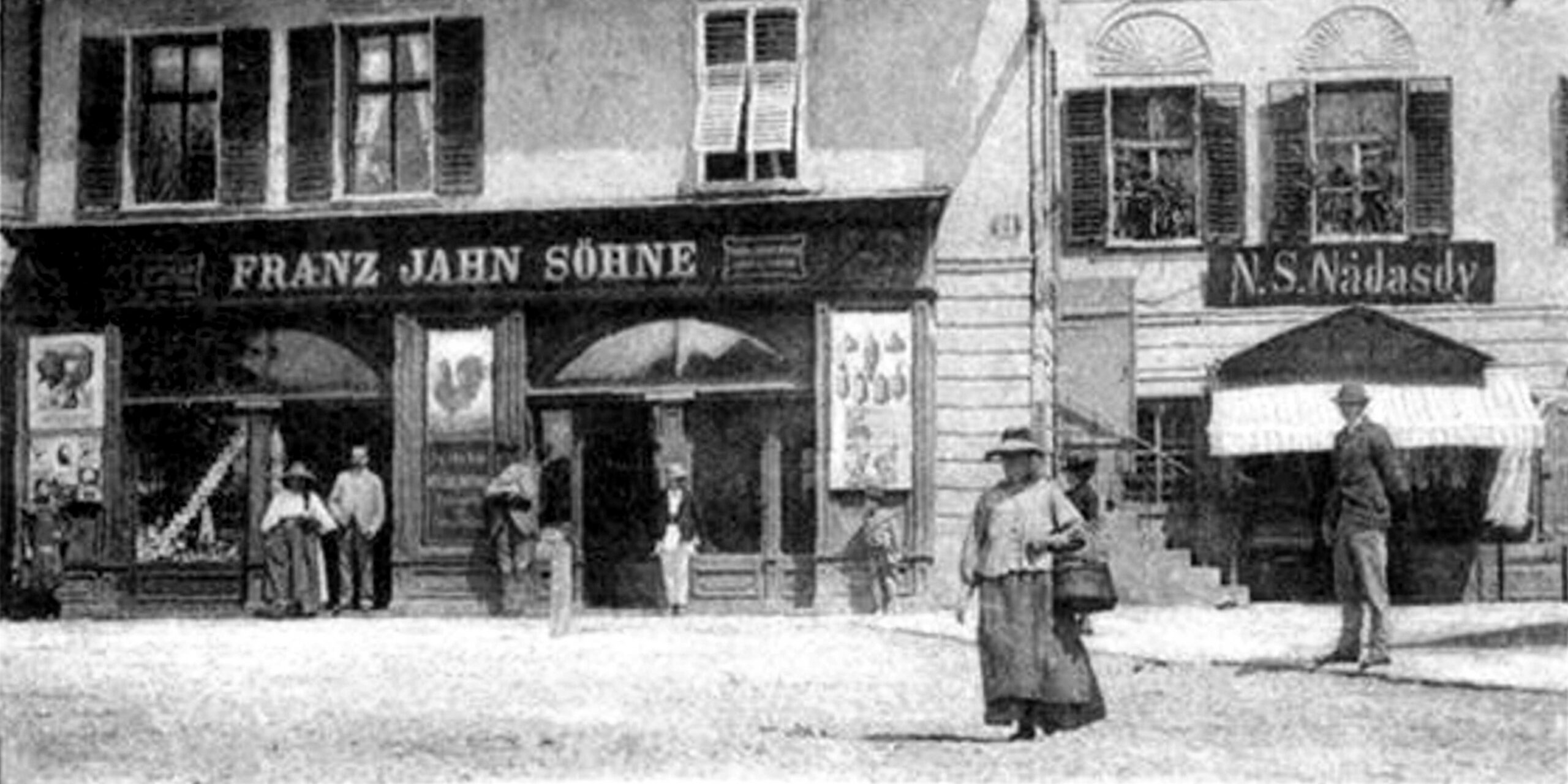 ~ Cartea de adrese, 1878; Jahn Franz, Magazin produse de băcănie ( spițerie ), materiale și vopsele (din 1842) – Piața Mică nr. 32. Franz Jahn a fost președintele „consiliului comercial” al Comercianților din Sibiu. | Jahn Franz, Spezerei, Materiel- und Farbwaren (seit 1842) – Kleiner Ring No. 32. Franz Jahn war Erster Vorstand des Handelsgremium der Kaufleute in Hermannstadt.