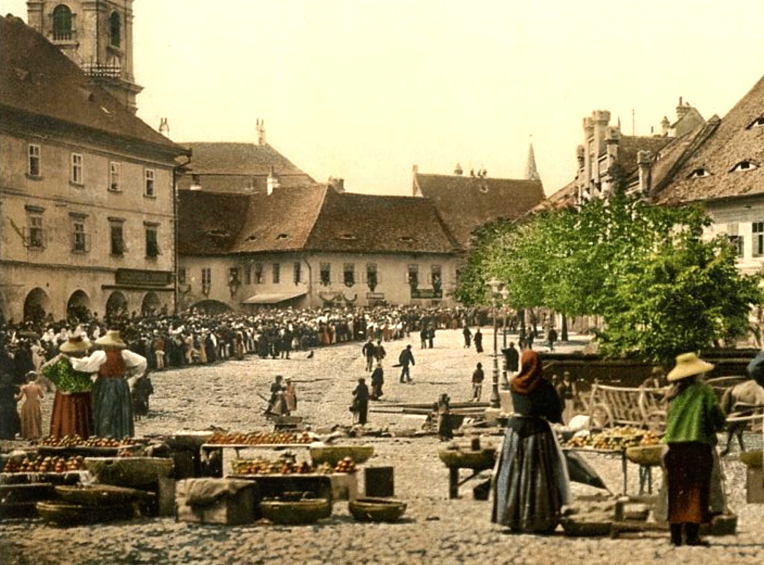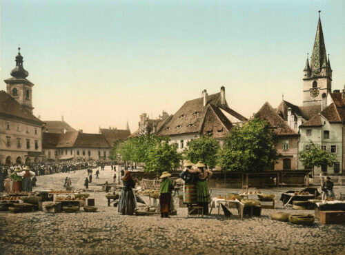 „Kleiner Ring in Hermannstadt Ende des 19. Jahrhunderts (1890~1900)” // „Piața Mică din Sibiu la sfârșitul secolului al XIX-lea (1890~1900)”