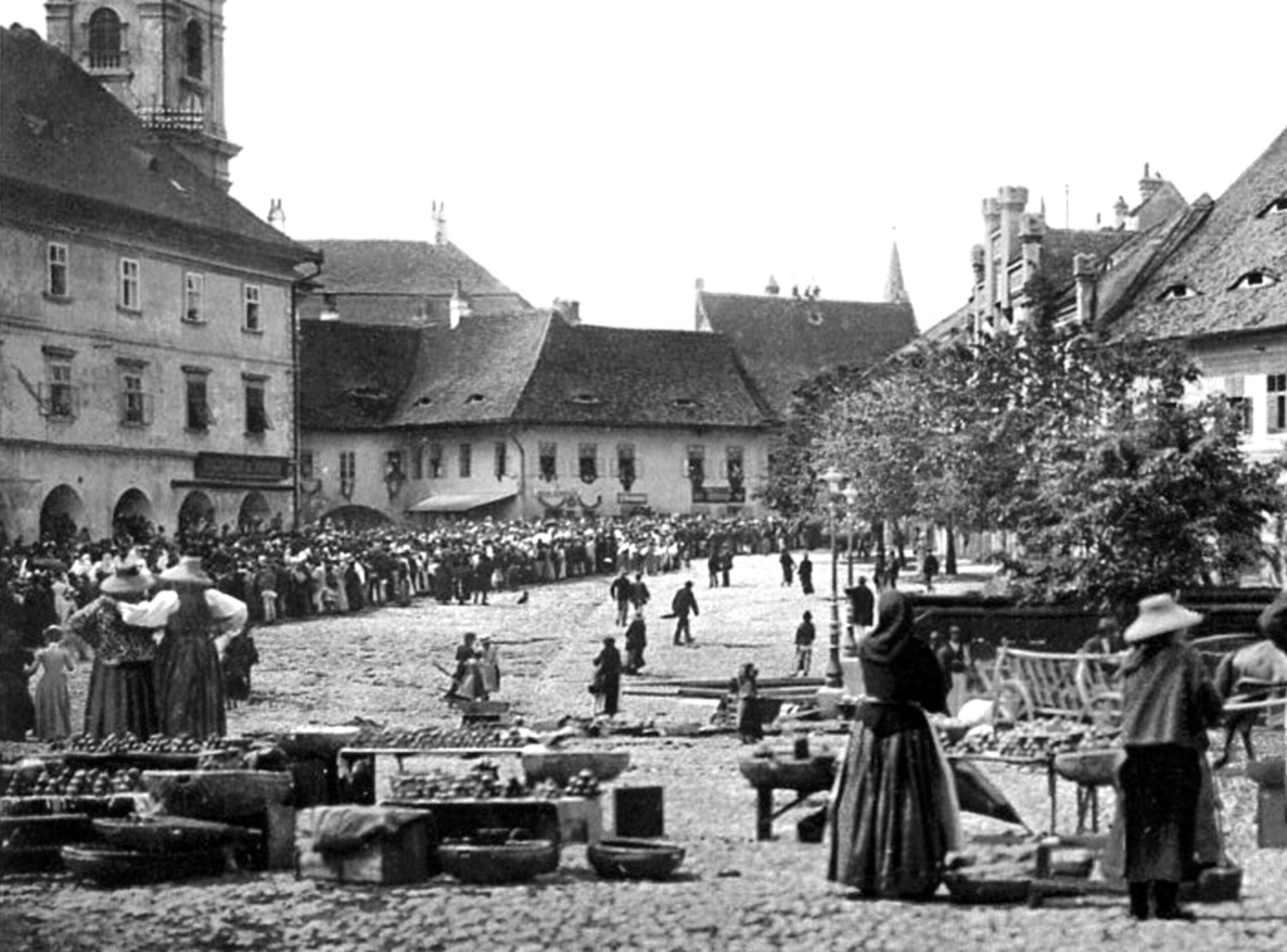 Din păcate nu se menționează data exactă sau evenimentul imortalizat pe placa de sticlă într-o zi de târg în Piața Mică. Fotograful a surptins o aglomerație de oameni ( mulțime de spectatori ) înșirată de-a lungul clădirilor situate pe latura sudică a Pieței Mici în zona Bisericii Catolice. Ferestrele de la primuele etaje ale clădirilor din fundal sunt impodobite cu girlande de flori.
