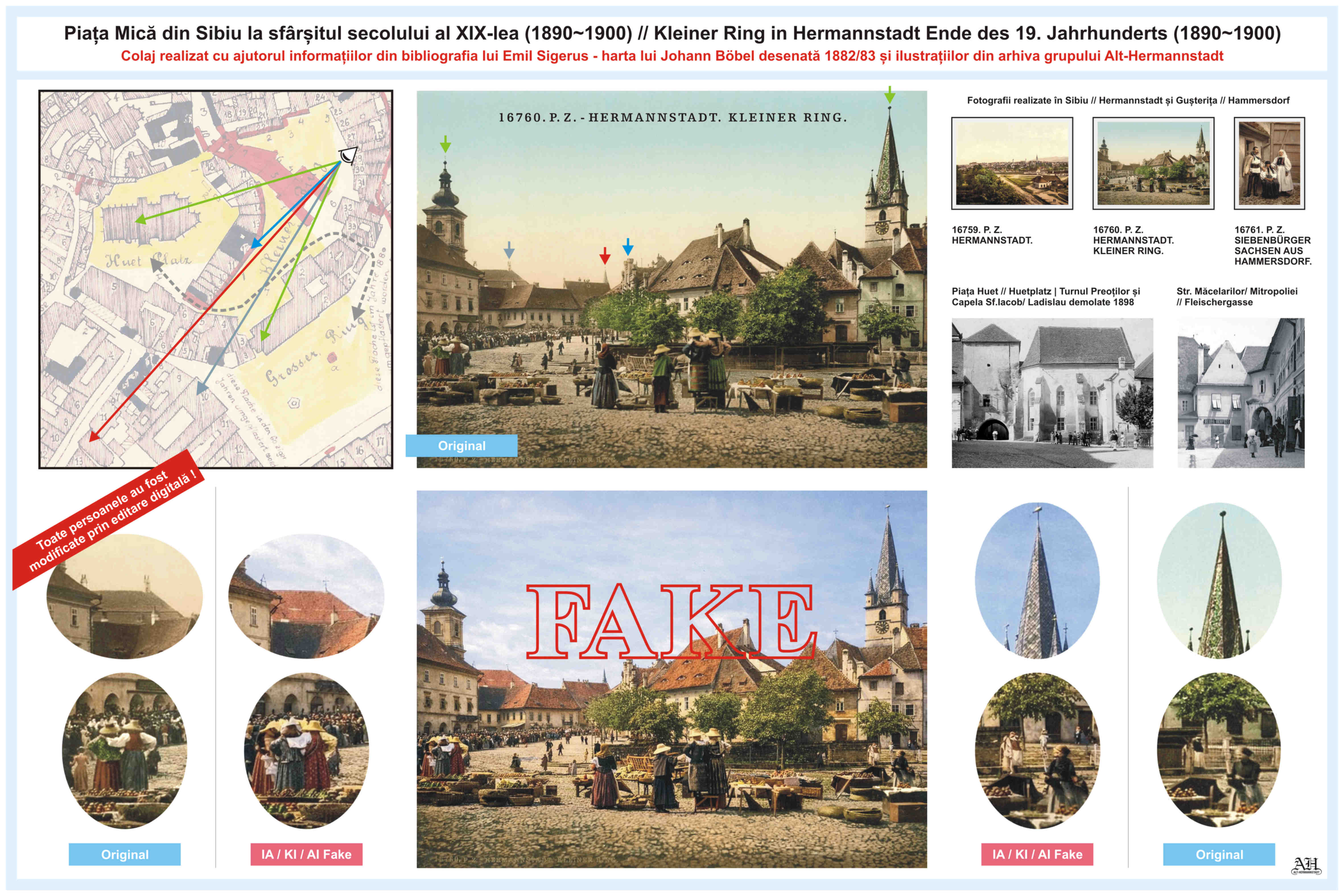 În colajul de față sunt ilustrate câteva greșeli apărute în varianta editată cu ajutorul inteligenței artificiale. De exemplu, cele 5 sfere de pe vârfurile turlelor Bisericii Evanghelice înlcuite cu 5 cruci sau cele 2 coșuri de fum de pe coama acoperișului Palatului Brukenthal care au fost, de asemenea, înlocuite cu 2 „cruci”, dar și multe alte modificări, care pot fi descoperite la o privire mai atentă. Și mai trist este faptul că unele persoane au dispărut sau au fost adăugate, cum ar fi: cei trei copii ivite la maeginea dreaptă a fotogrfiei sau persoanele adăugate grupului de femei din partea stângă a ilustrației. Ca să nu mai vorbim de hainele schimbate…