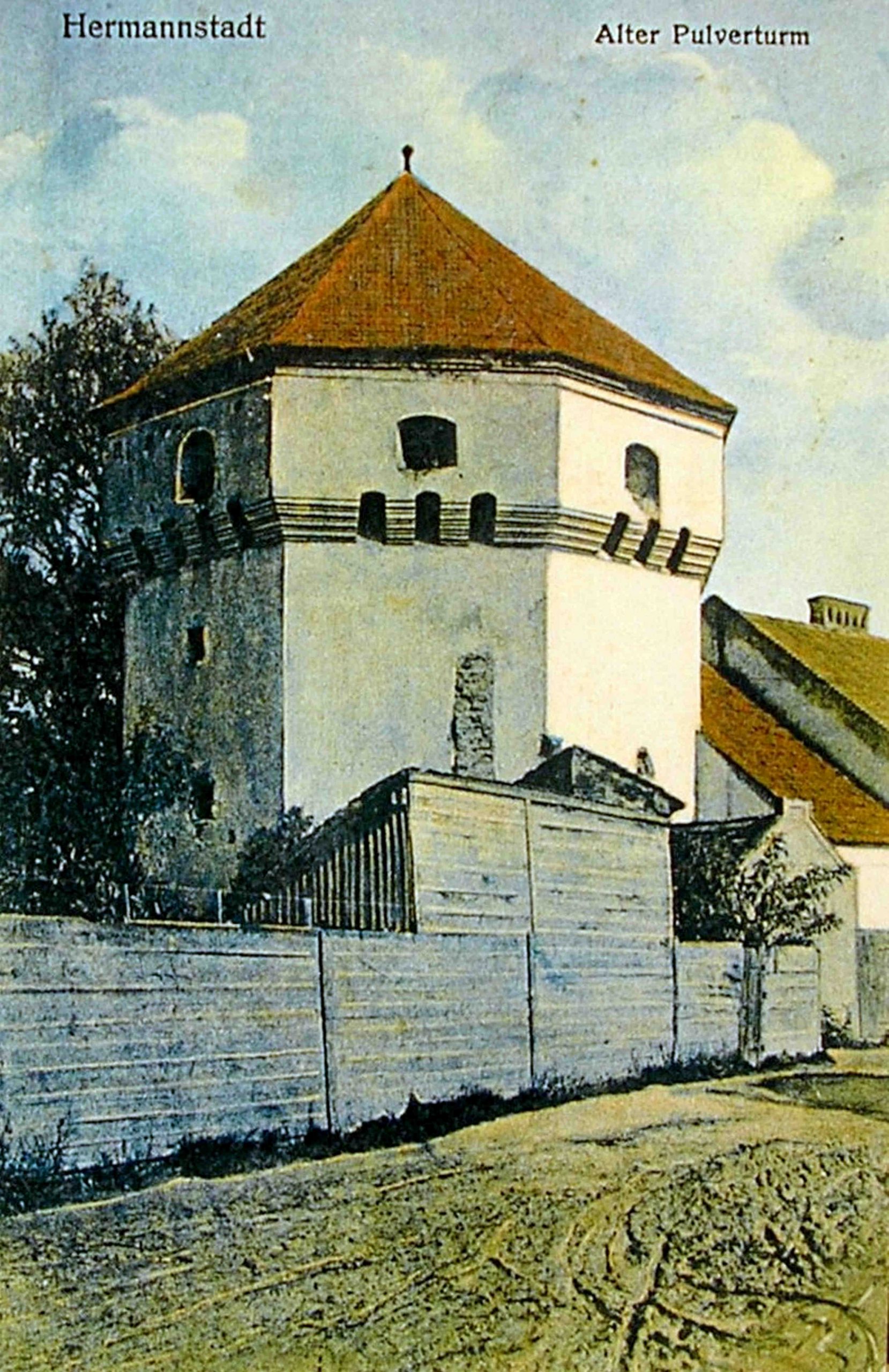 Turnul Pielarilor, construit în anii 1475-1485, făcea parte din cea de-a IV-a centură de fortificații a orașului Sibiu. Turnul se află la intersecția străzilor Pulberăriei, Zidului și Rimski-Korsakov. Turnul Pielarilor a fost apărat de breasla curelarilor / pielarilor. Fotografie din arhiva Alt-Hermannstadt.