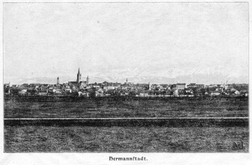 Sibiu privit dinspre nord-vest. Fotografie de la sfârșitul sec. al XIX-lea. ~ ilustrație din cartea „Bilder aus der heimischen Geschichte” // „Imagini din istoria locală” tipărită la tipografia sibiana Krafft & Drotleff A.G. 1933.
