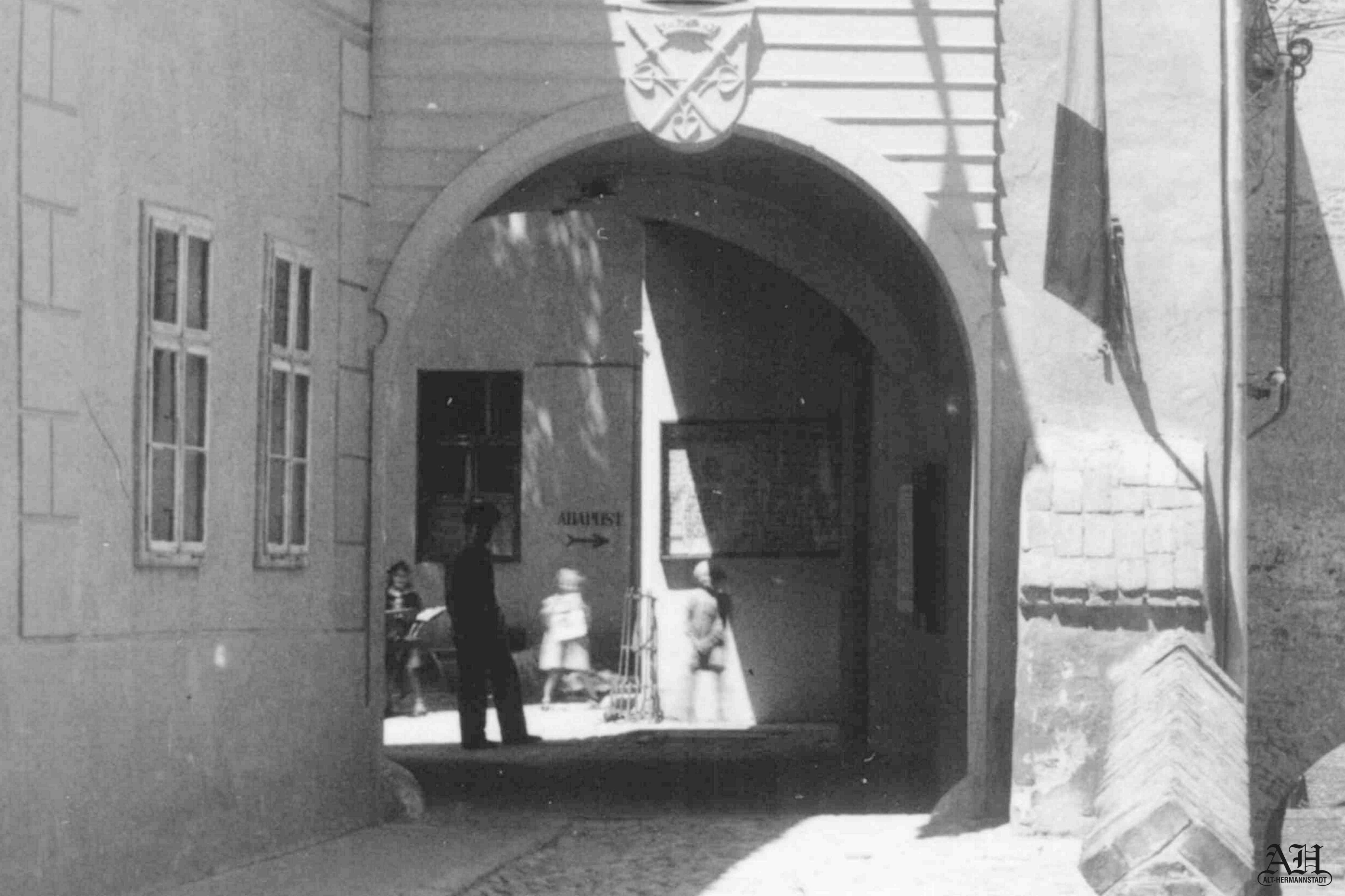 În clădirea Altemberger-Pempflinger se afla în perioada celui de-al Doilea Război Mondial un adăpost (vezi inscripția de pe peretele clădirii din curte). Autorul fotografiei: Emil Fischer.