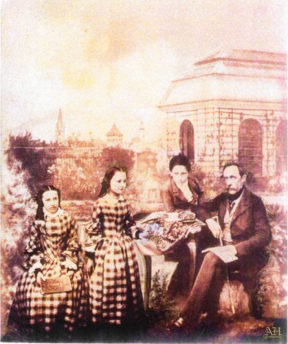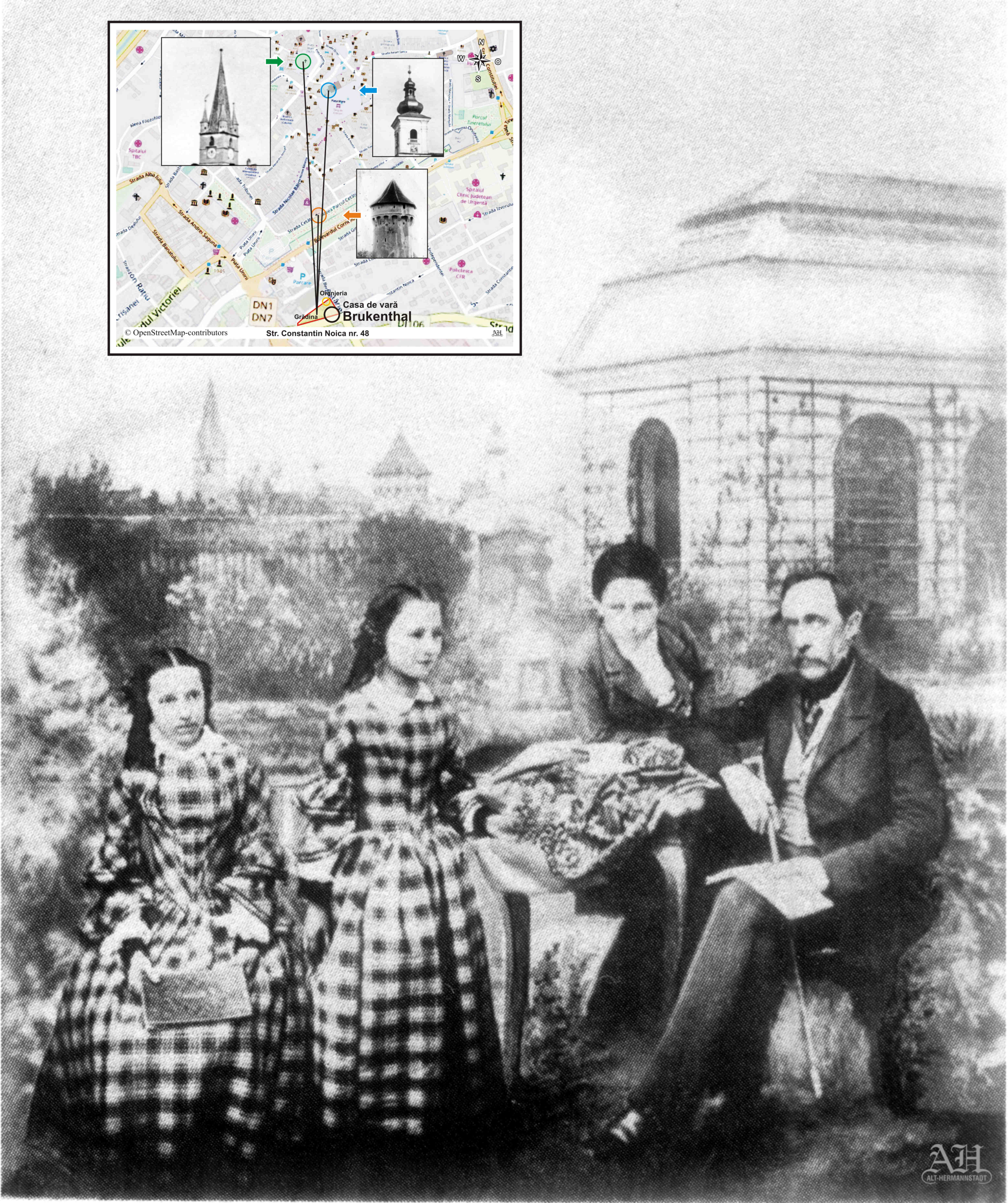 Baronul Josef von Brukenthal împreună cu copiii lui în grădina casei de vară, Sibiu, str. Constantin Noica nr. 48. Reproducere fotografică (fotomontaj) realizată de Theodor Glatz c. 1858. În fundal se distinge turnul Bisericii Evanghelice, Turnul Archebuzierilor (str. Cetătii) și turnul Bisericii Catolice.
