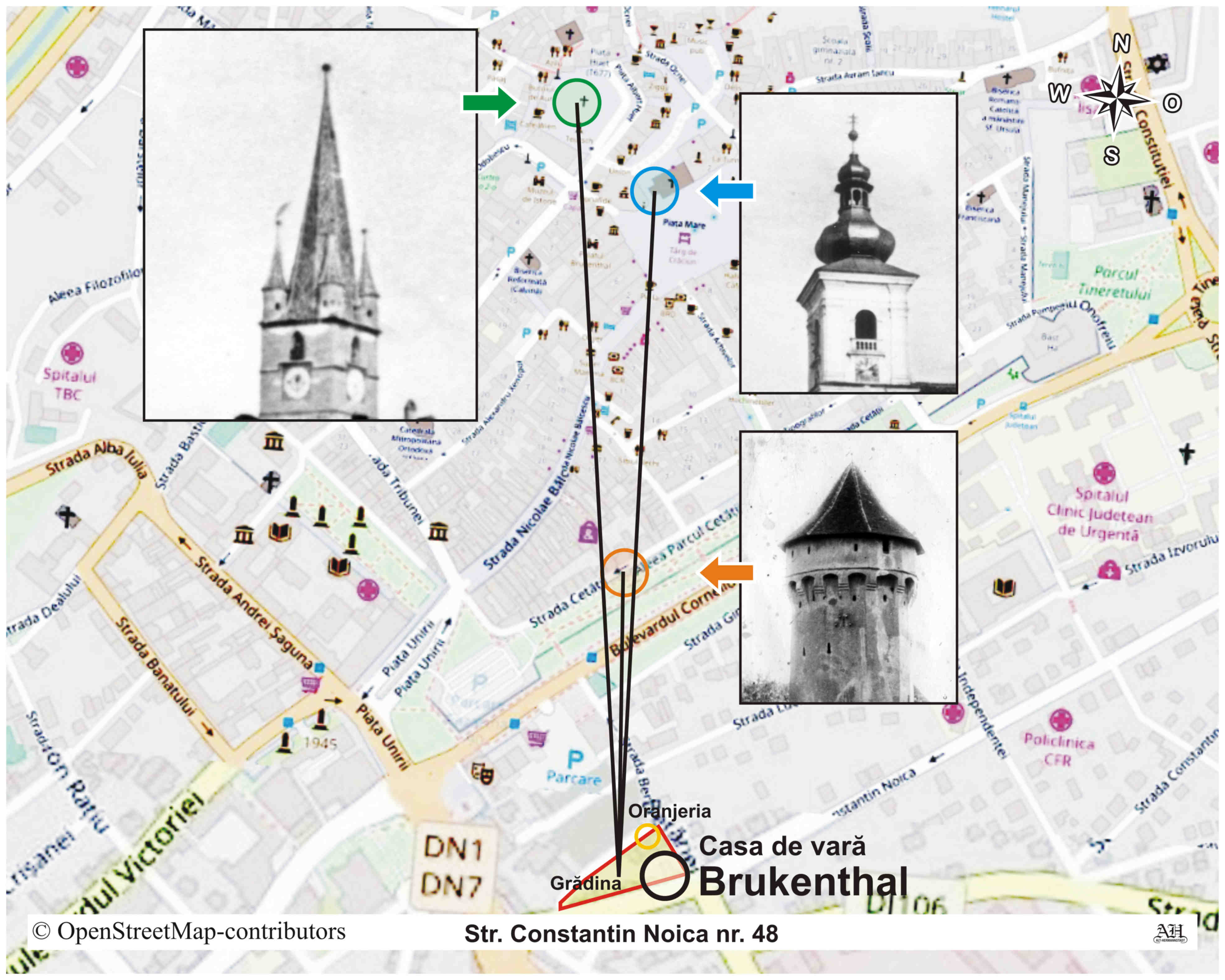 Colaj relizat cu ajutorul hărților orașului Sibiu din 1699, 1751, 1858 și 1875 ~ Surse informații: “Ungarisches Magazin” din 1787 ~ Emil Sigerus (E.S.) – Otto Czekelius (O.C.) – Arold Panktatz (A.P.) – Johann Böbel (J.B.) și cărțile de adrese din 1875-1933