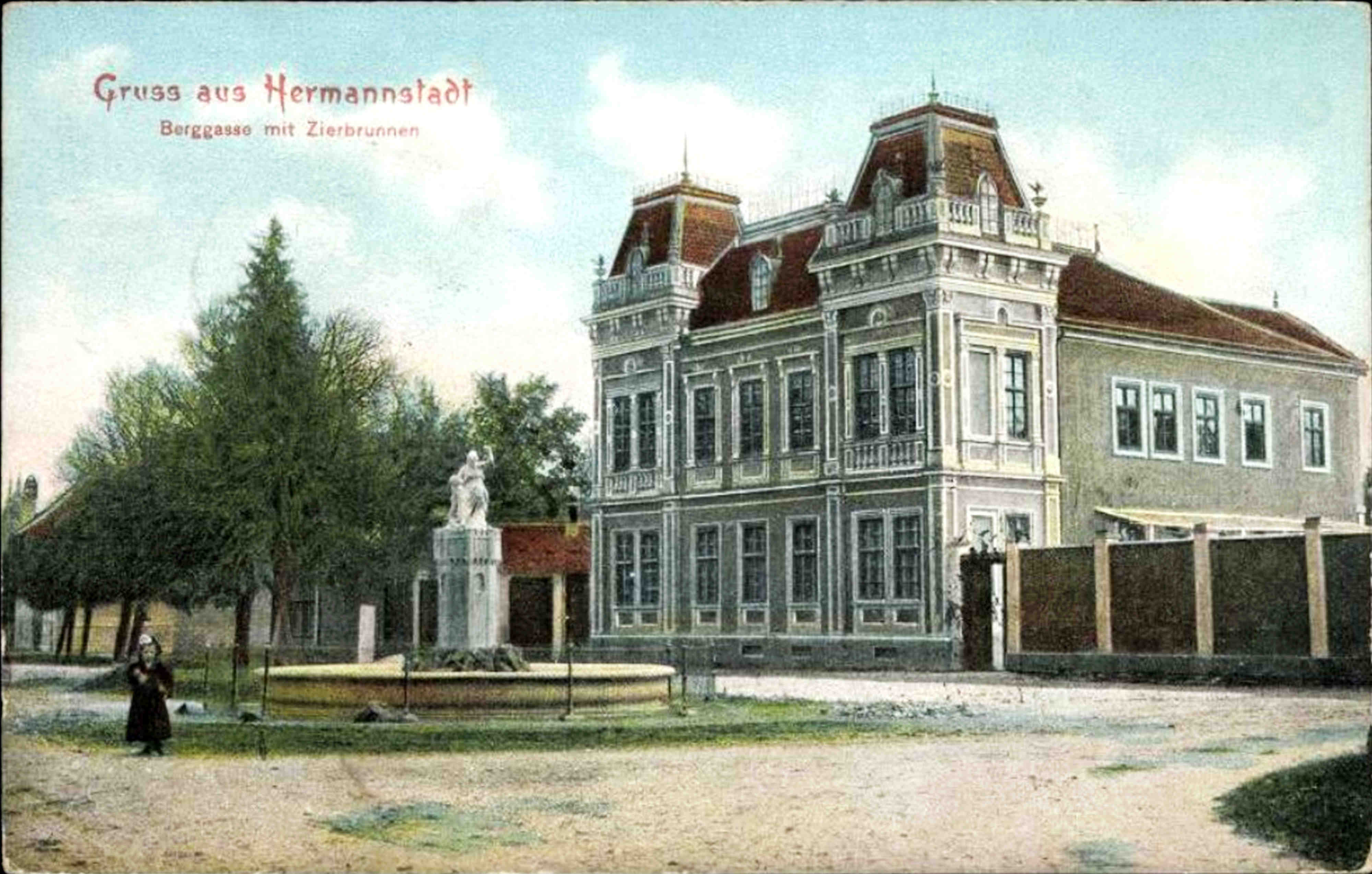 Villa Michaelis cu fântăna ornamentală ‚Josefbrunnen‘ / ‚Fântăna Josefină‘. Fotografie realizată de Emil Fischer în jurul anului 1910. Fotografie din arhiva grupului Alt-Hermannstadt.