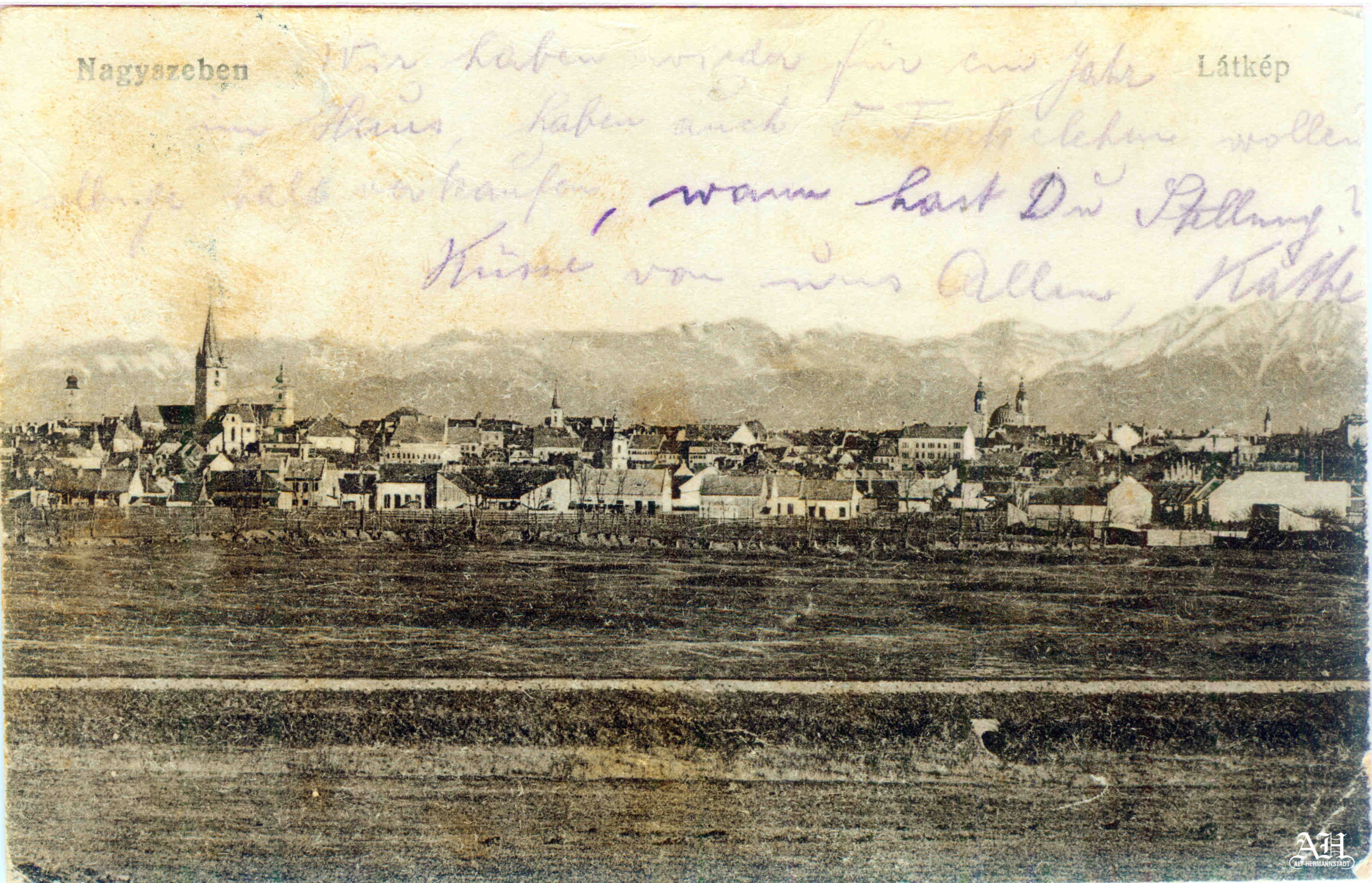 Sibiu ~ panoramă // Hermannstadt ~ Panorama // Nagyszeben ~ Látkép. Sibiu privit dinspre nord-vest / Carte poștală circulata anii 1910.
