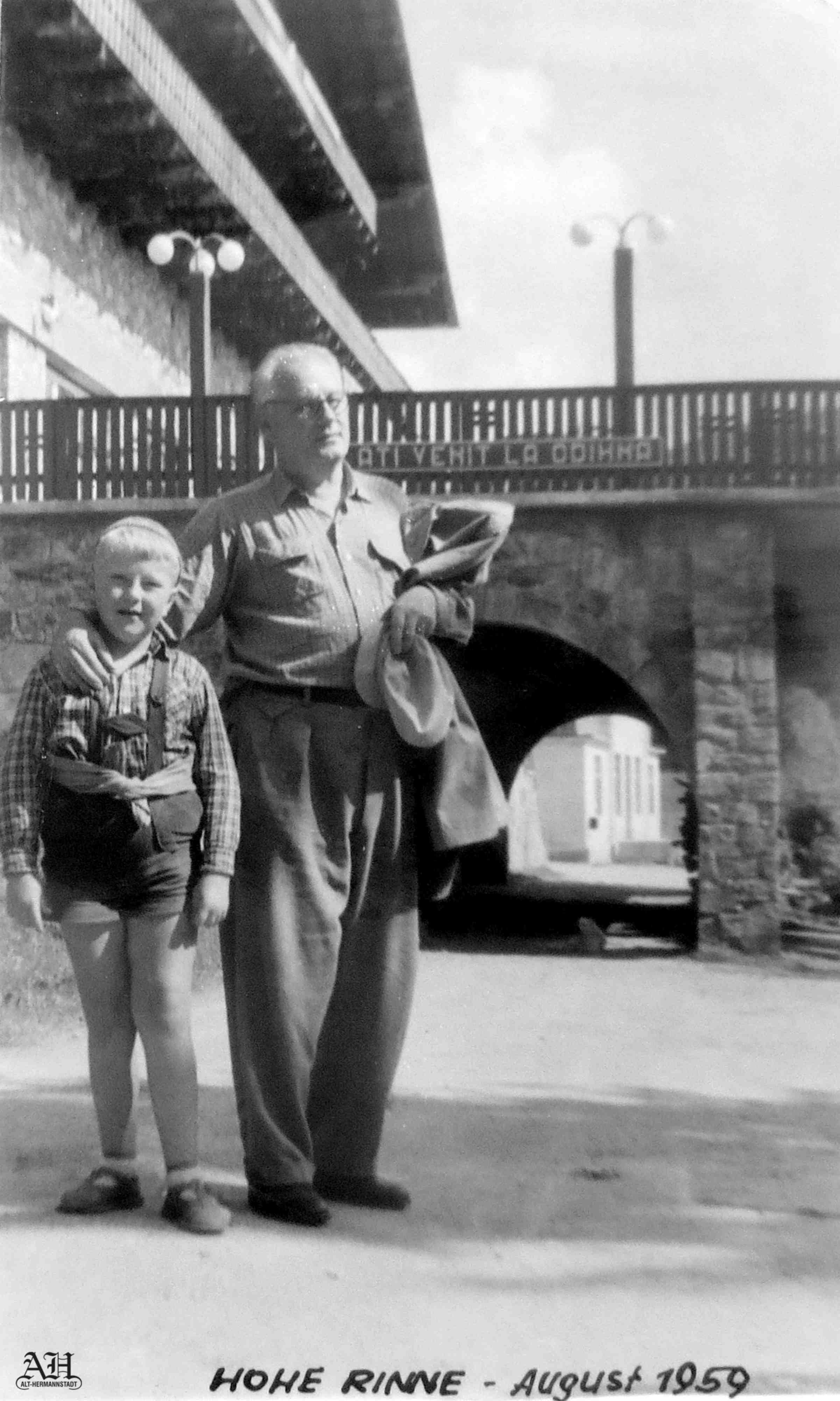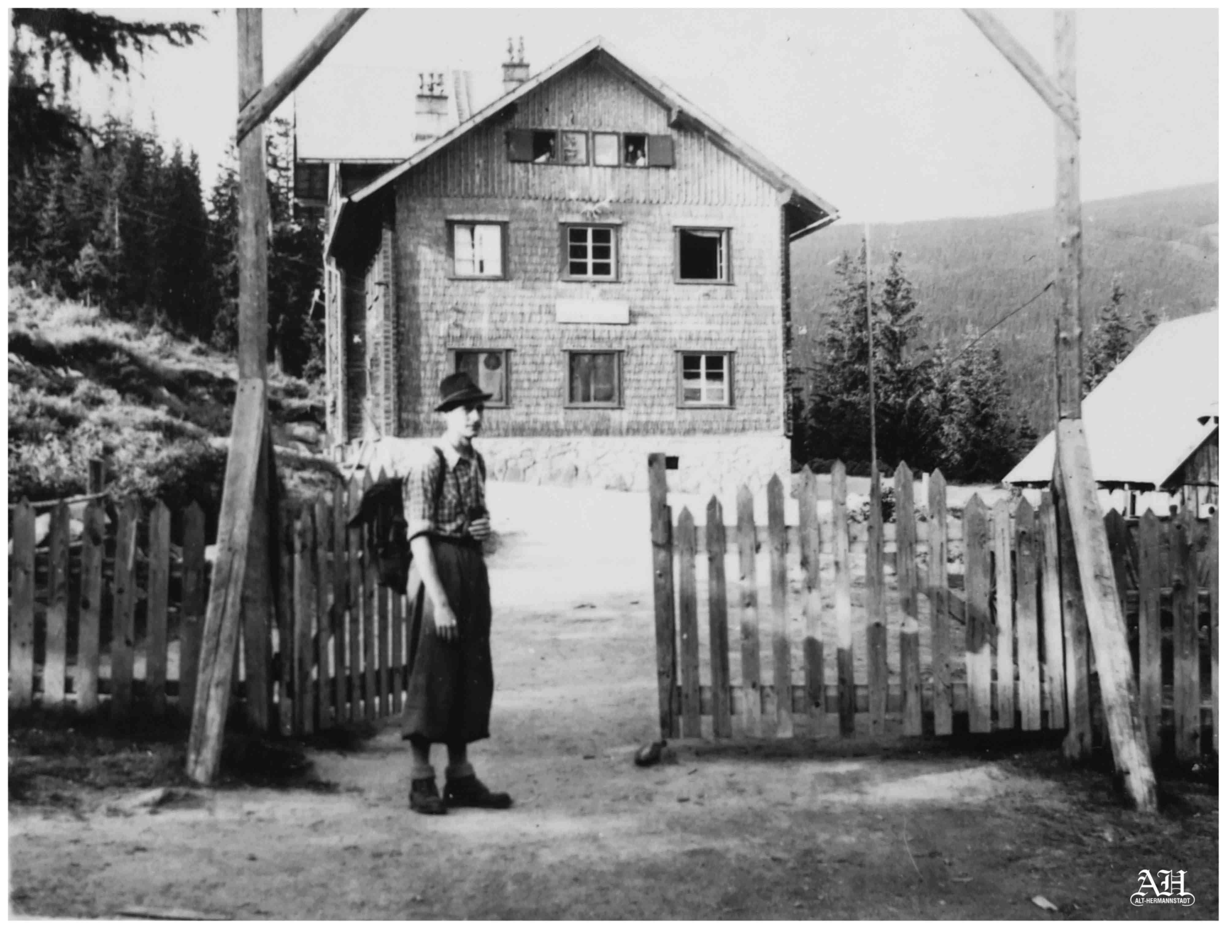 Fotografie realizată în fața terasei Sanatoriului Militar din Păltiniș. Pe balustrada terasei era montată o pancartă cu lozinca „BINE AȚI VENIT LA ODIHNĂ“. In Memoriam Lorenz Thal.