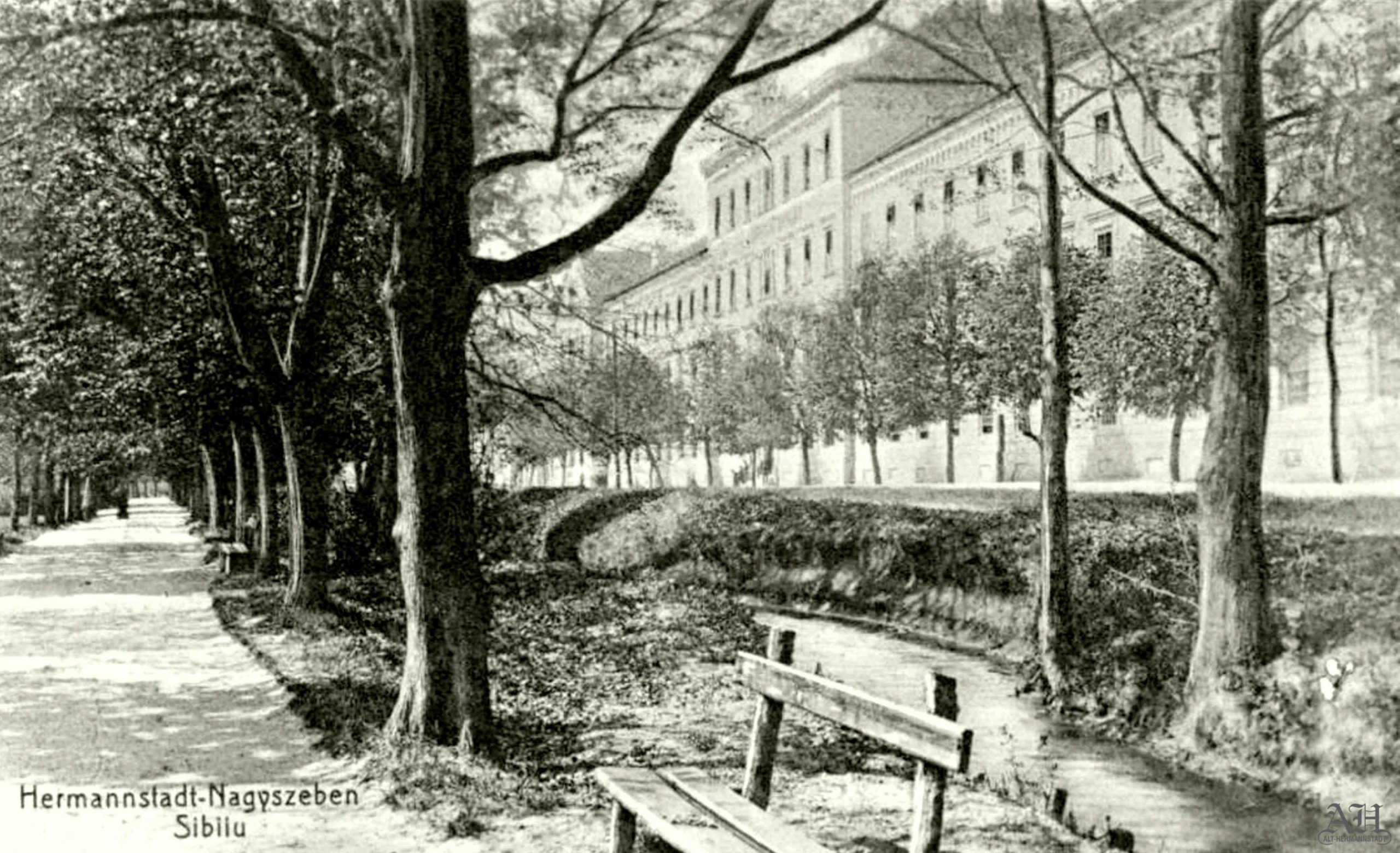 „Gruss aus Hermannstadt – Partie im Erlenpark” – Erlenpark in den späten 1890er Jahren. Hinter der Erlenpromenade befindet sich das K.u.K. Garnisonsspital. Das Foto wurde in Emil Fischers Fotostudio zu Hermannstadt hergestellt. Postkarte aus dem „Verlag v. Georg Mayer’s Buchhandlung, Hermannstadt” – gelaufen 1900 (23 November) -