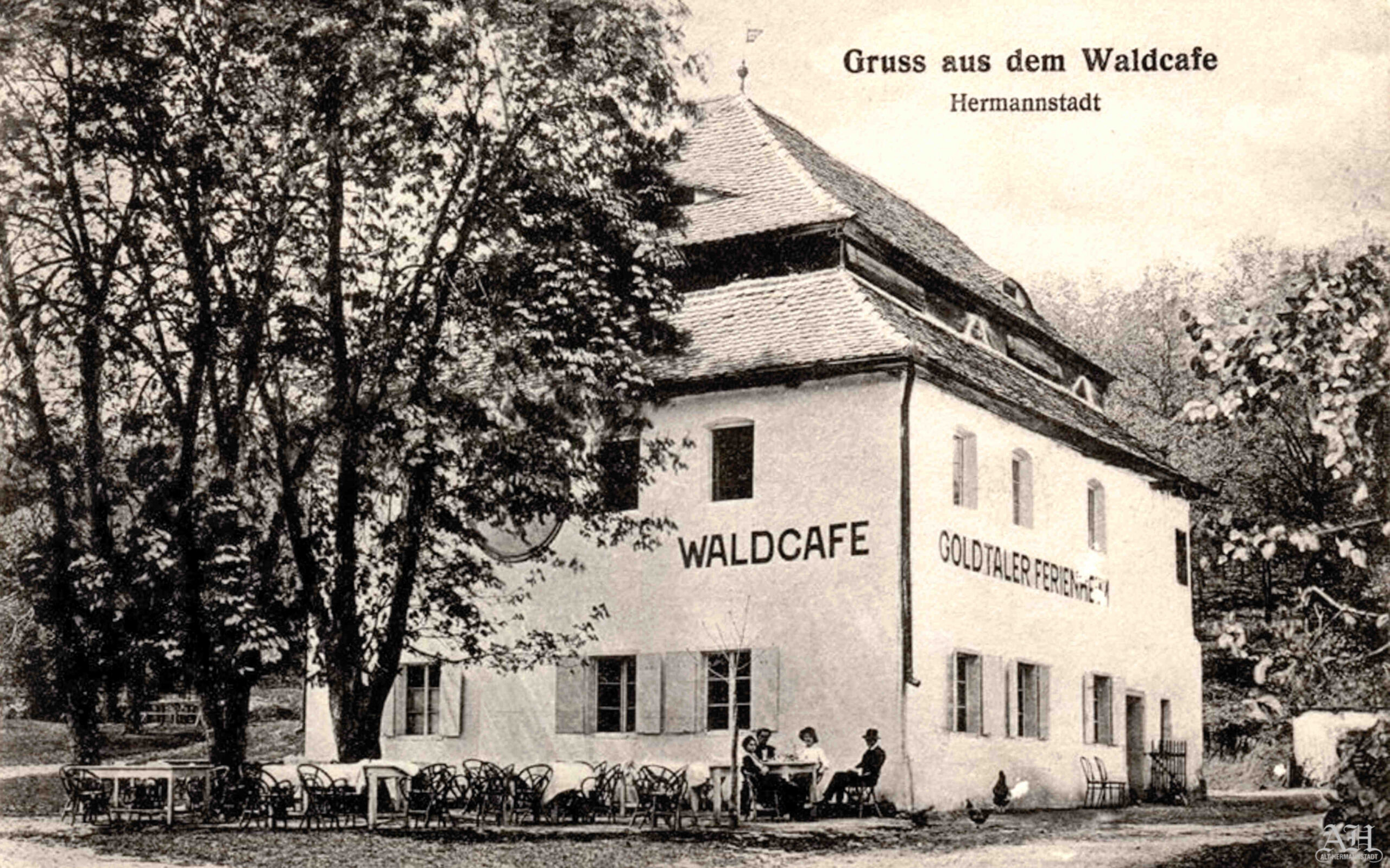 Acest frumos desen în creion colorat a fost realizat de Karl Eduard Closius în data de 23 mai 1948. Clădirea cunoscută sibienilor sub denumirea de, „Waldcafe – Goldtaler Ferienheim” ( Căminul de vacanță din Valea Aurie ), se afla lângă Moara Schreyer, pe locul unde în perioada comunistă a fost construi restaurantul „Cabana Valea Aurie”. Stema orașului Sibiu de pe fațada clădirii ne informează că această casă se afla în proprietatea orașului.