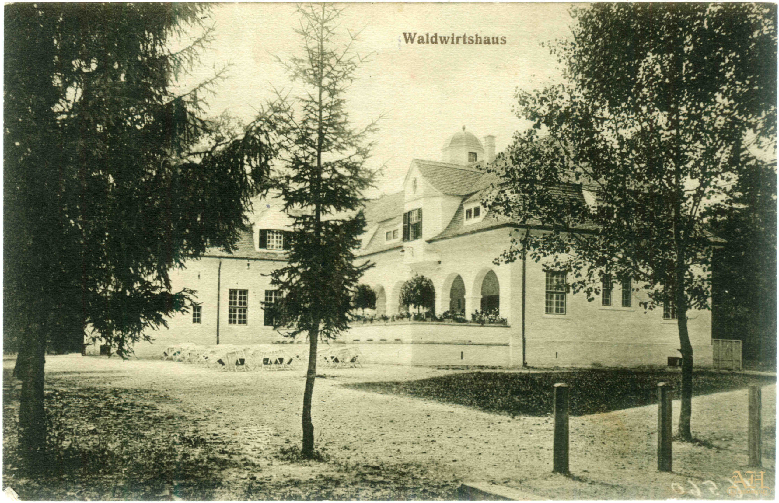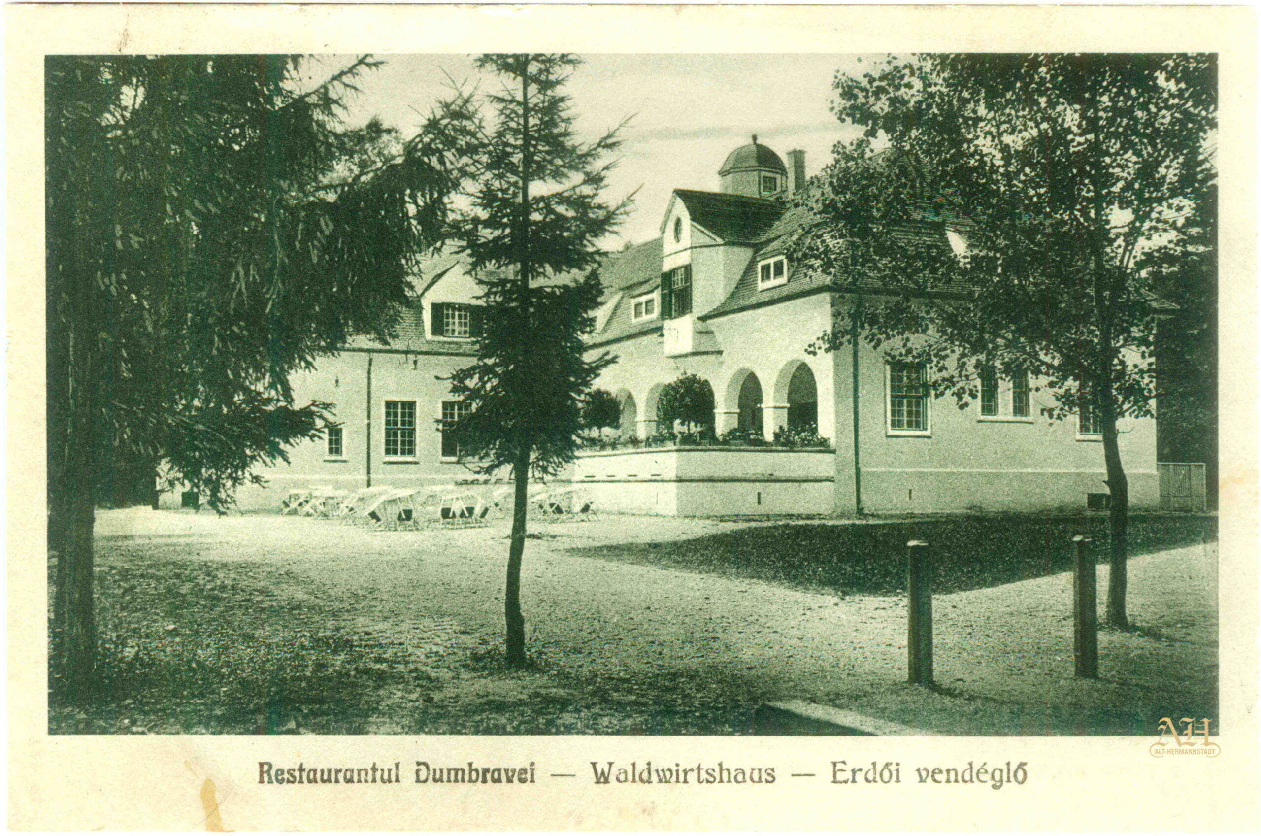Noul restaurant din pădurea Dumbrava Sibiului. Carte Poștală tip LEVELEZÖ-LAP – realizată la Institulul tipografic sibian „Kunstanstalt Jos. Drotleff, Hermannstadt“ 1917 / circulată 1918. Clădirea noului han din Pădurea Dumbrava (Sibiului) // Junger Wald a fost construită la începutul celui de al doilea deceniu al secolului al XX-lea, după planurile arhitectului sibian Ludwig Orendt (1876-1930).