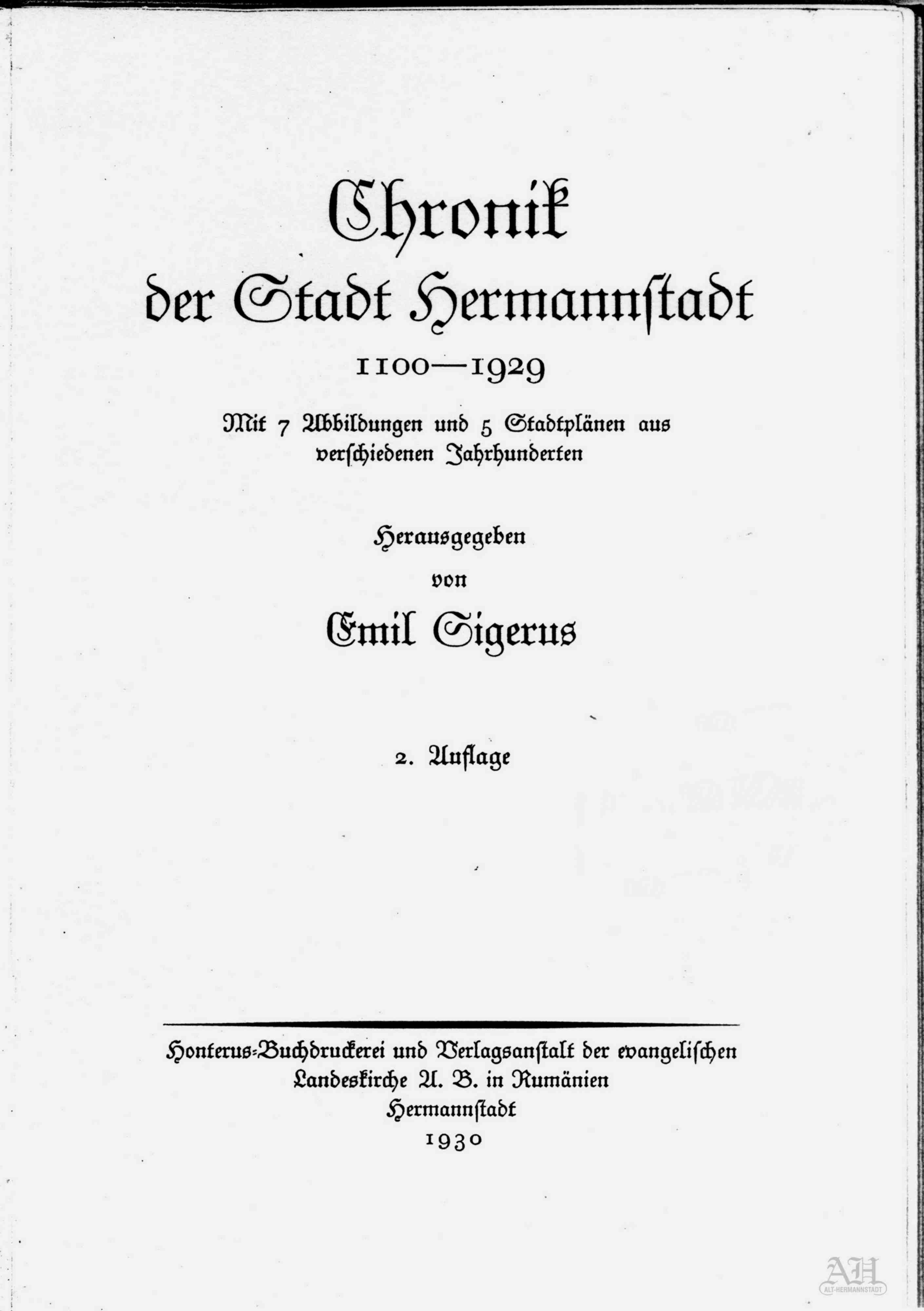 Ilustrații din renumita carte a lui Emil Sigerus „Cronica orașului Sibiu 1100-1929“ // „Chronik der Stadt Hermannstadt 1100-1929“ (ediția a doua). Cartea a fost editată și tipărită la tipografia Bisericii Evanghelice C.A. din România „Honterus” ~ Sibiu 1930.
