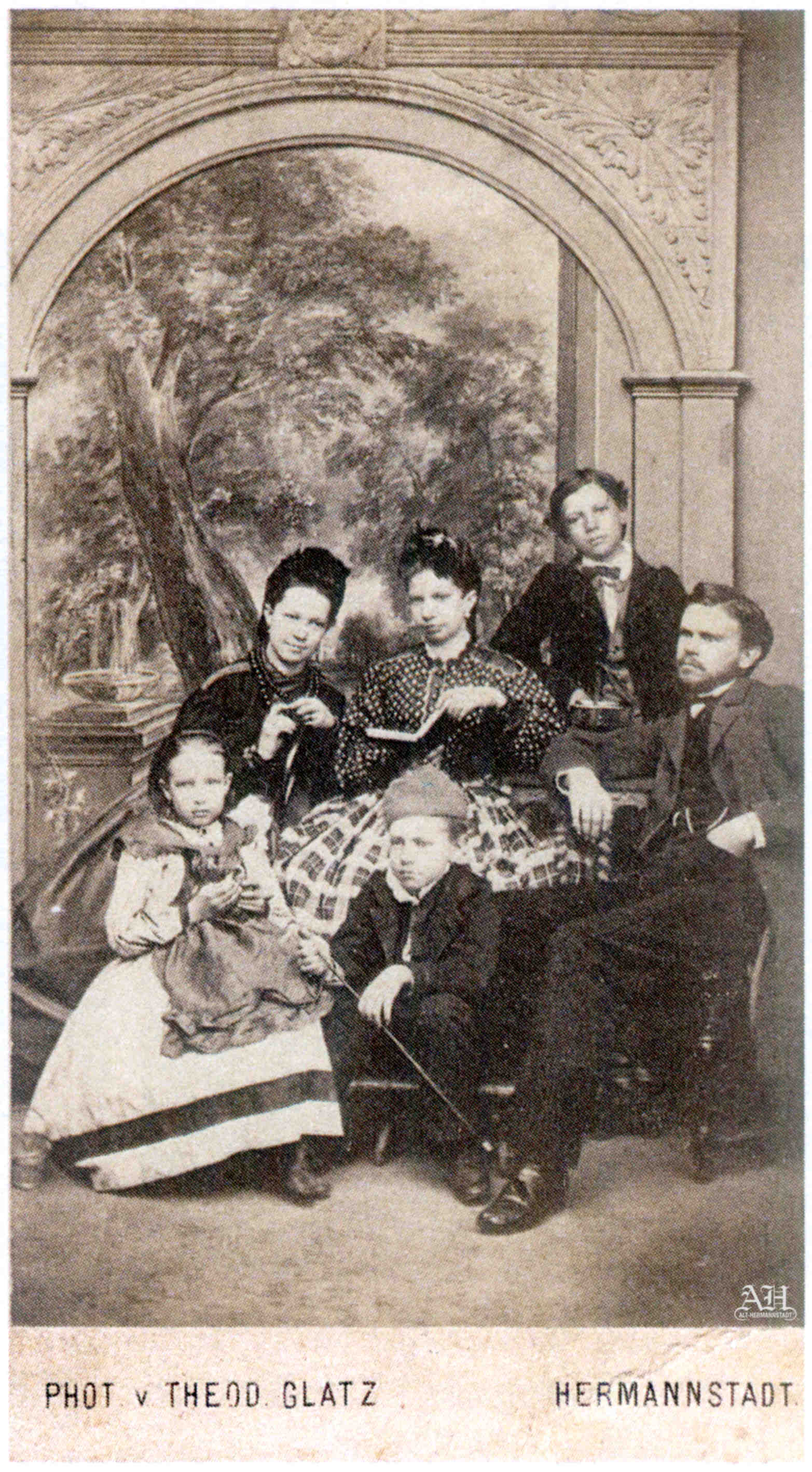 Emil Sigerus (în fotografie avea 9 ani, baiatul sezând în fața/jos) a fost un renumit etnograf, colecționar, istoric și scriitor sas din Transilvania. A fost al cincilea copil al notarului Karl Sigerus.