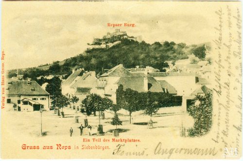 Cetatea Rupea și o parte din Piață / „Repser Burg – Ein Teil des Marktplatzes. Carte poștală tip LEVELEZÖ-LAP circulată 1901, editată de Editura Hans Gross din Rupea / Verlag von Hans Gross, Reps.