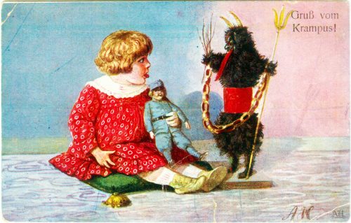 Demonul „Krampus“ provine din mitologia germană. El este o creatura hibridă, urâcioasă, jumătate demon, jumătate țap, care apare de crăciun, odată cu Moș Nicolae și pedepsește copiii neascultători. Pe cei foarte răi îi răpește și duce direct în iad. -