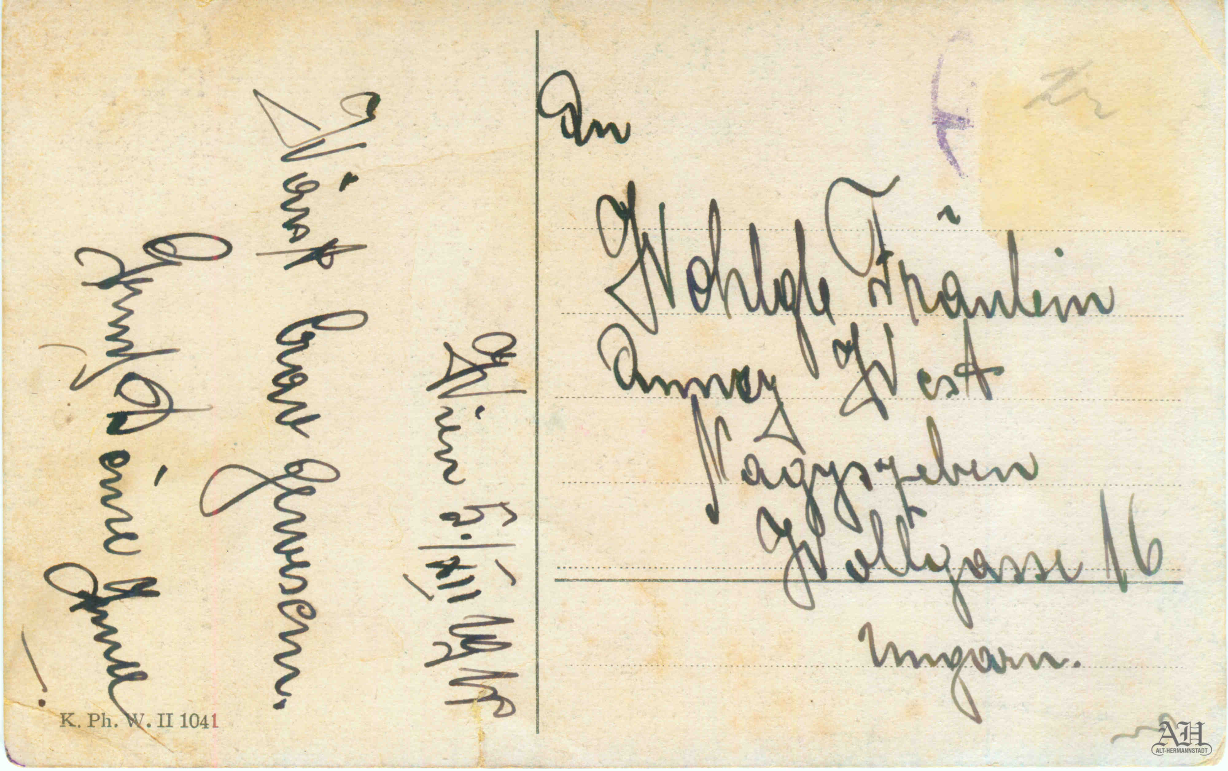 Carte poștală circulată internațional între Viena și Sibiu decembrie 1919, adrestată domnișoarei Anny West, domiciliată în Sibiu, str. Wollgasse (str. Lânei) nr16.