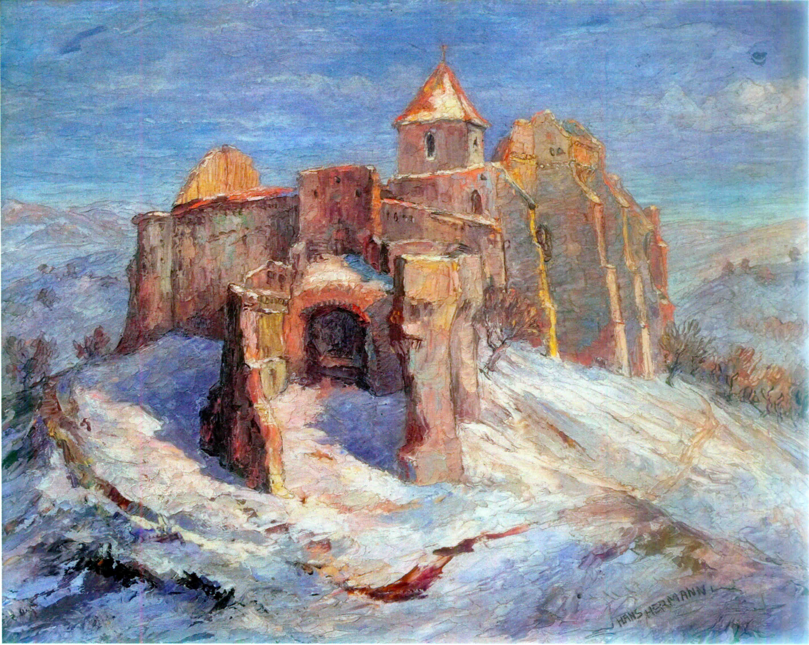 Cetatea din Slimnic // Stolzenburg // Szelindek (Nagyszelindek). Peisaj de iarna realizat de pictorul și graficianul sibian Hans Hermann 1945. (fotografie din arhiva grupului Alt-Hermannstadt)