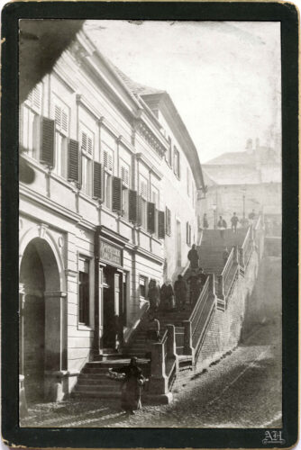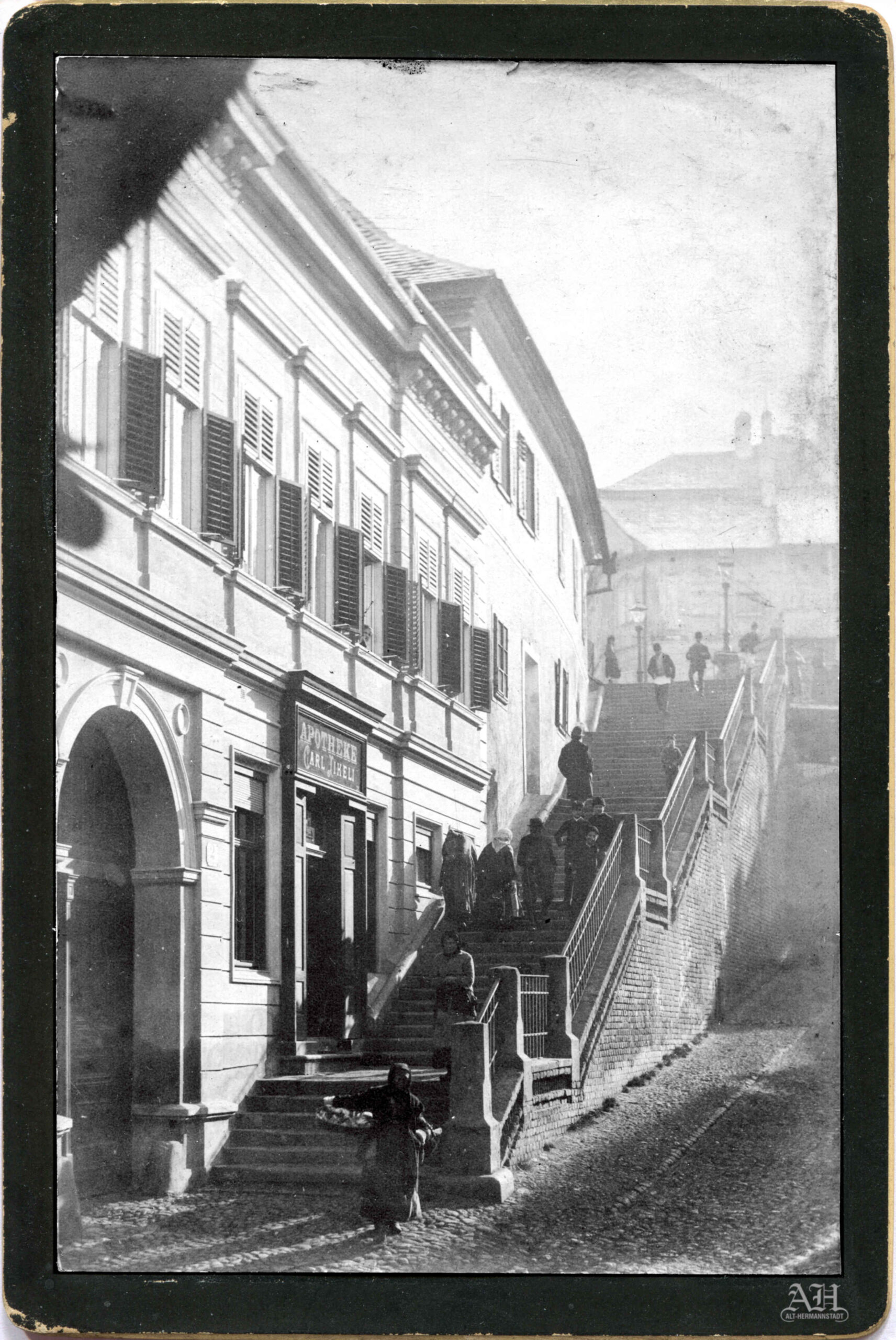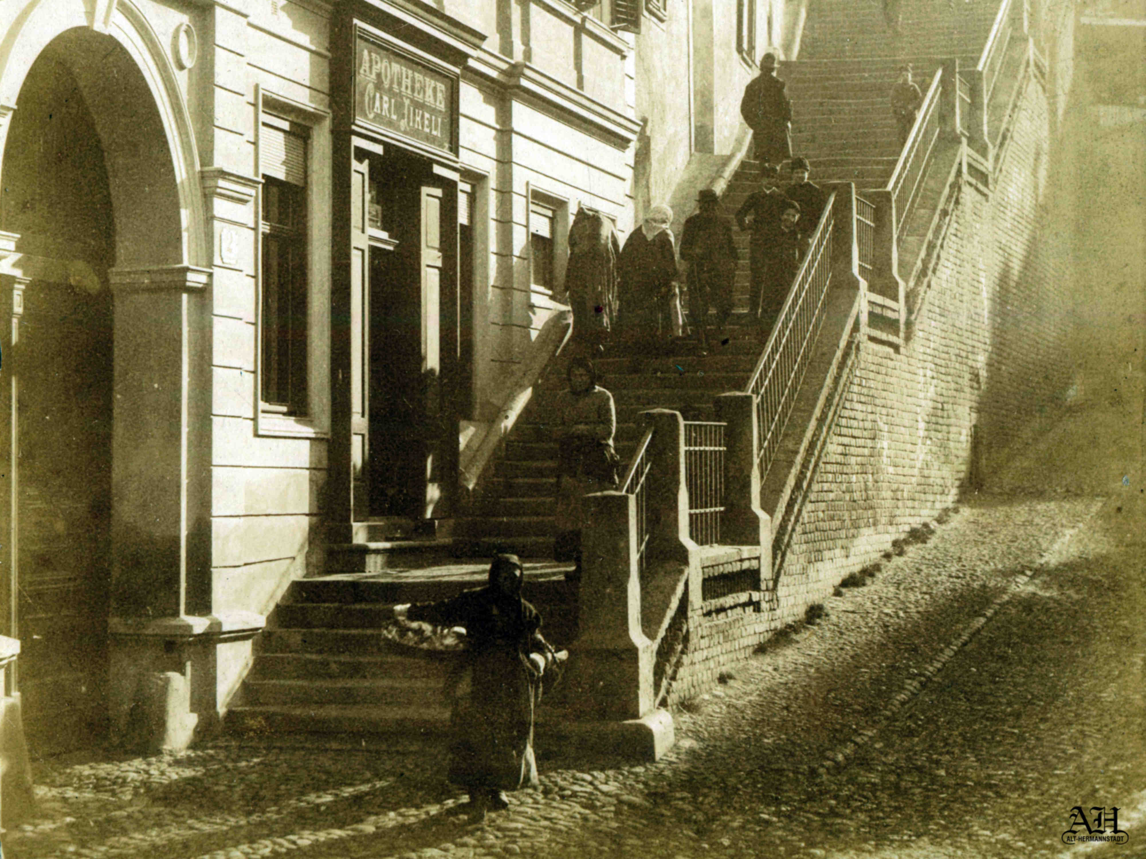 Scara Burger de pe strada Ocnei // Burgergasse // Polgár utca face legătura între Orașul de Sus și Orașul de Jos. În clădirea din partea stângă (str. Ocnei nr. 4) se afla farmacia sibianului Karl Jikeli. Fotografie de la sfârșitul sec. al XIX-lea.