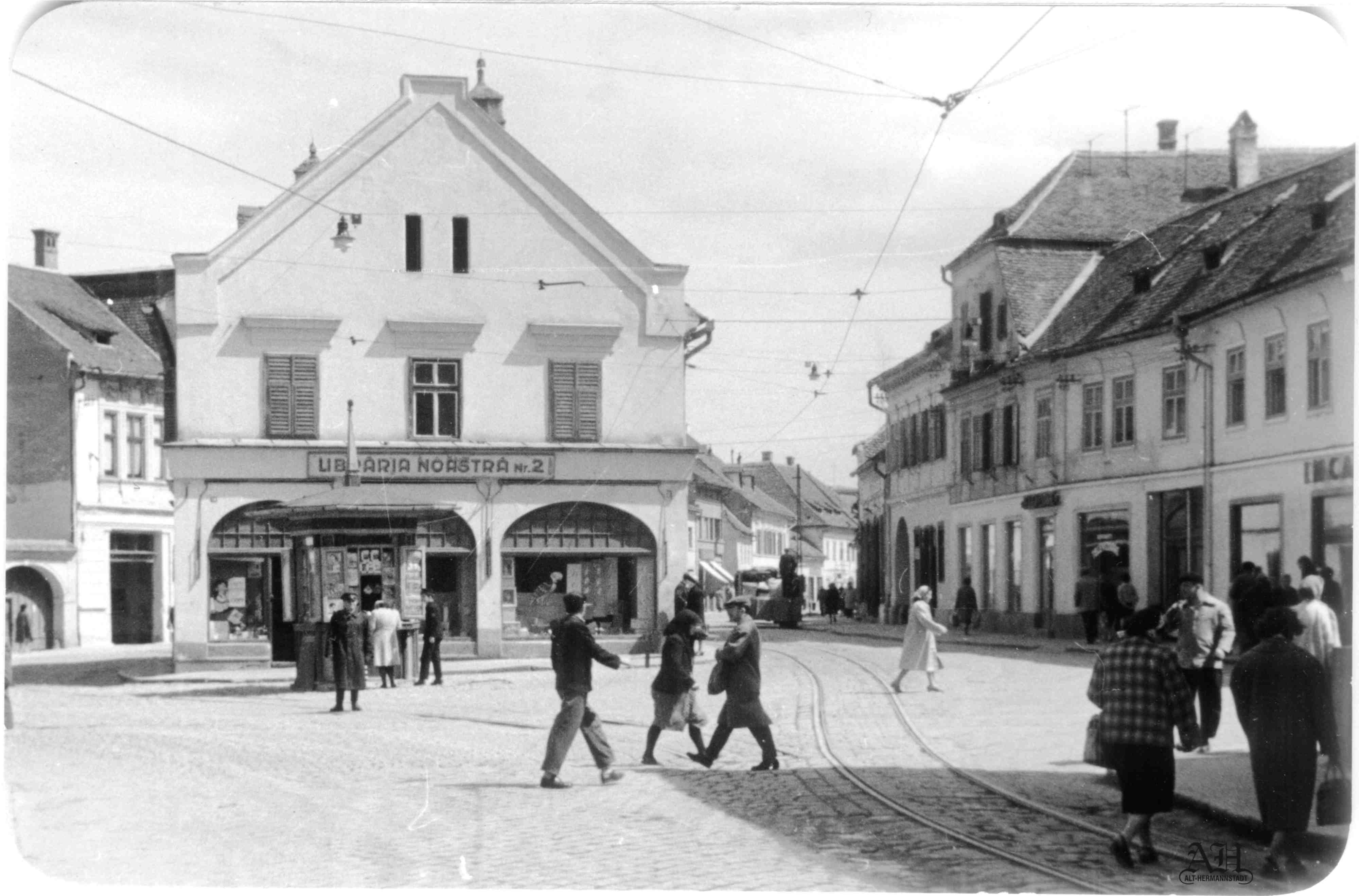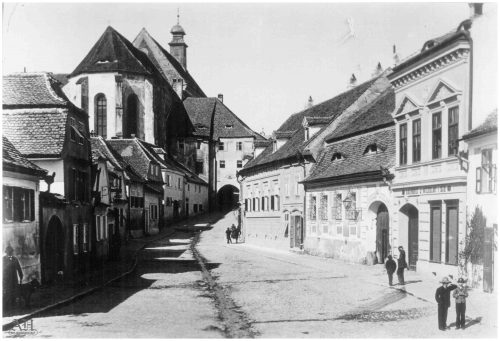 Fotografie din atelierul lui Theodor Glatz realizată 1866/67. Există altă variantă, reproducere fotografică (după același negativ, clișeu de sticlă) în care apare ceasul nou cu cadran negru pe turnul Bisericii Evanghelice. Această variantă „anacronică“, retușată/ prelucrată, a fost datată greșit, între 1881 și 1883! (1881 din cauza ceasului nou, montat în 1881 și 1883 din cauza gardul de fier forjat, care a fost construit 1883 și care bineințeles nu apare în această fotografie din 1866/67).