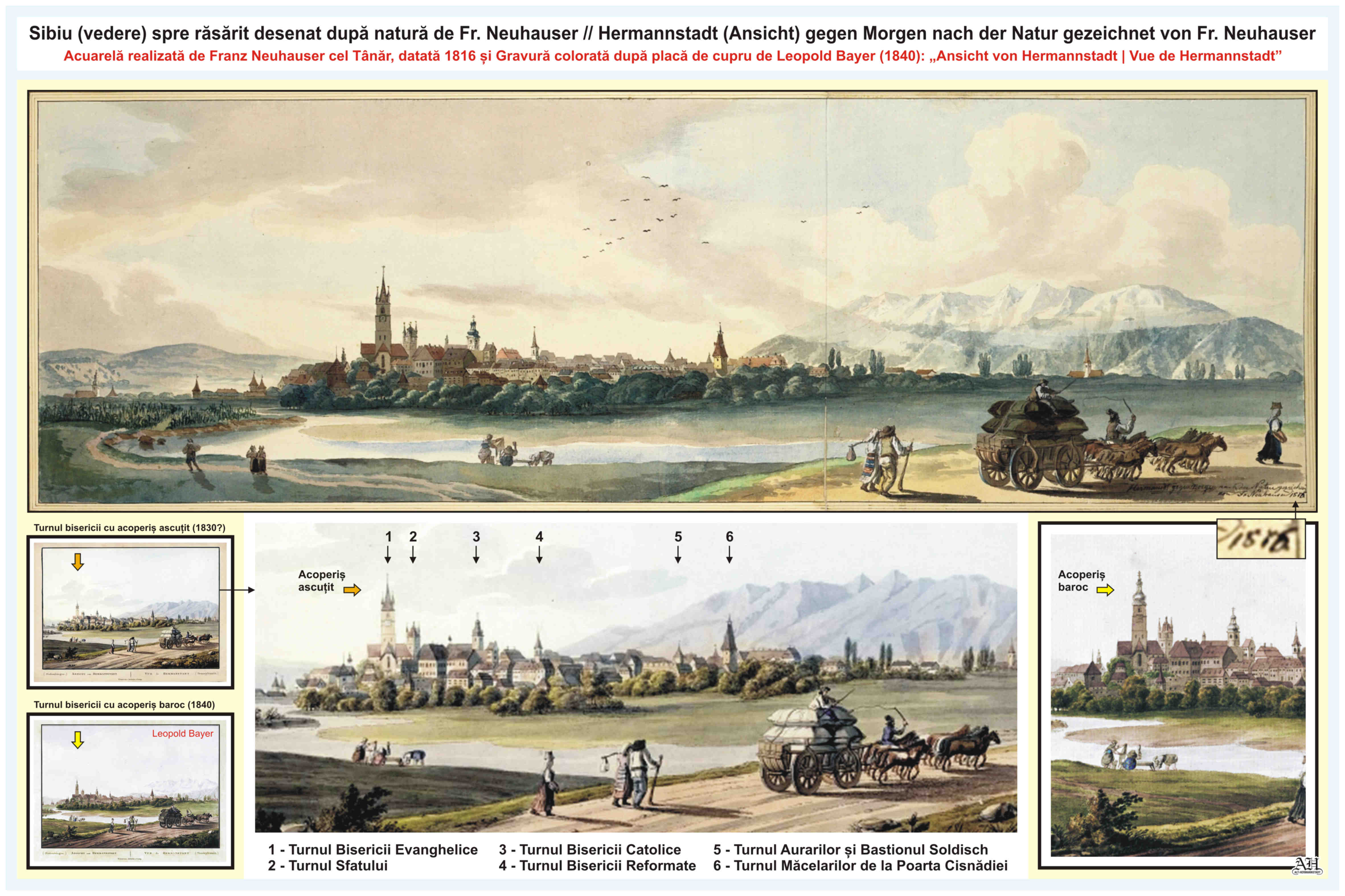 În acuarela lui Neuhauser turnul Bisericii Evanghelice apare cu un acoperiș ascuțit (gotic), cu toate că a fost pictată 1816 „după natură“, an în care turnul avea acoperiș baroc! Asta înseamnă că Neuhauser a realizat pictura după un desen mai vechi (înainte de 1805) sau datarea picturii a fost schimbată (vezi detaliul „1816” din colaj). În gravura lui Leopold Bayer din 1840 turnul bisericii apare cu acoperiș baroc. Ilustrații din arhiva grupului Alt-Hermannstadt. -