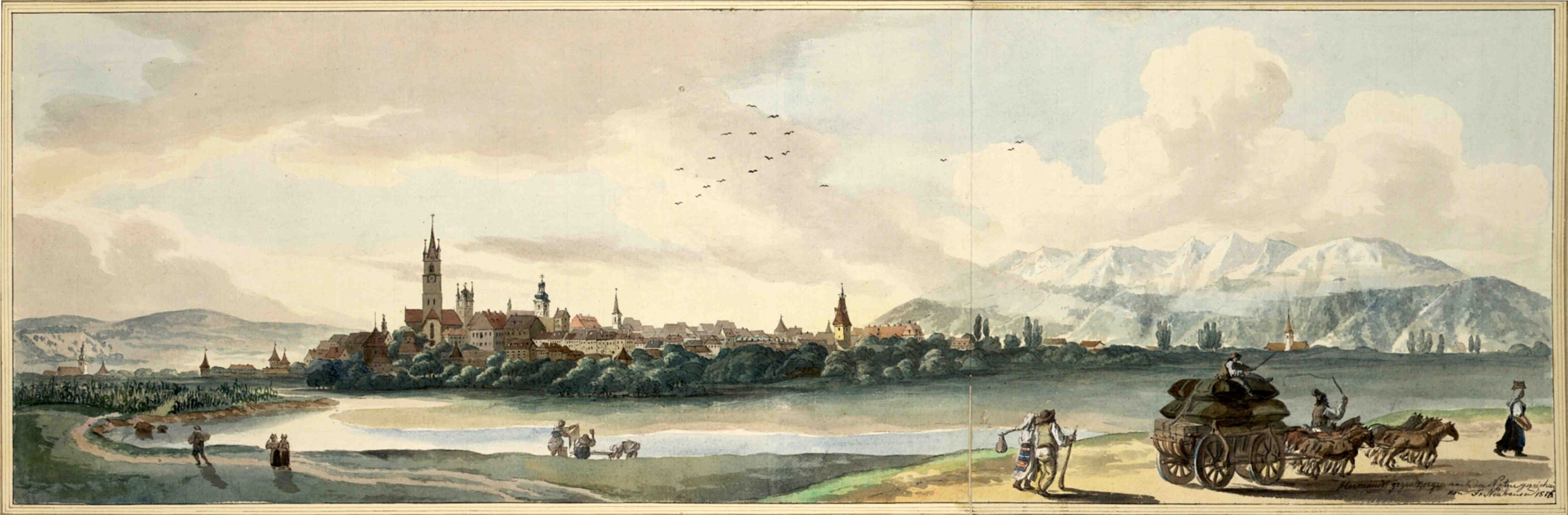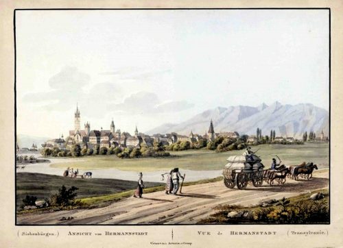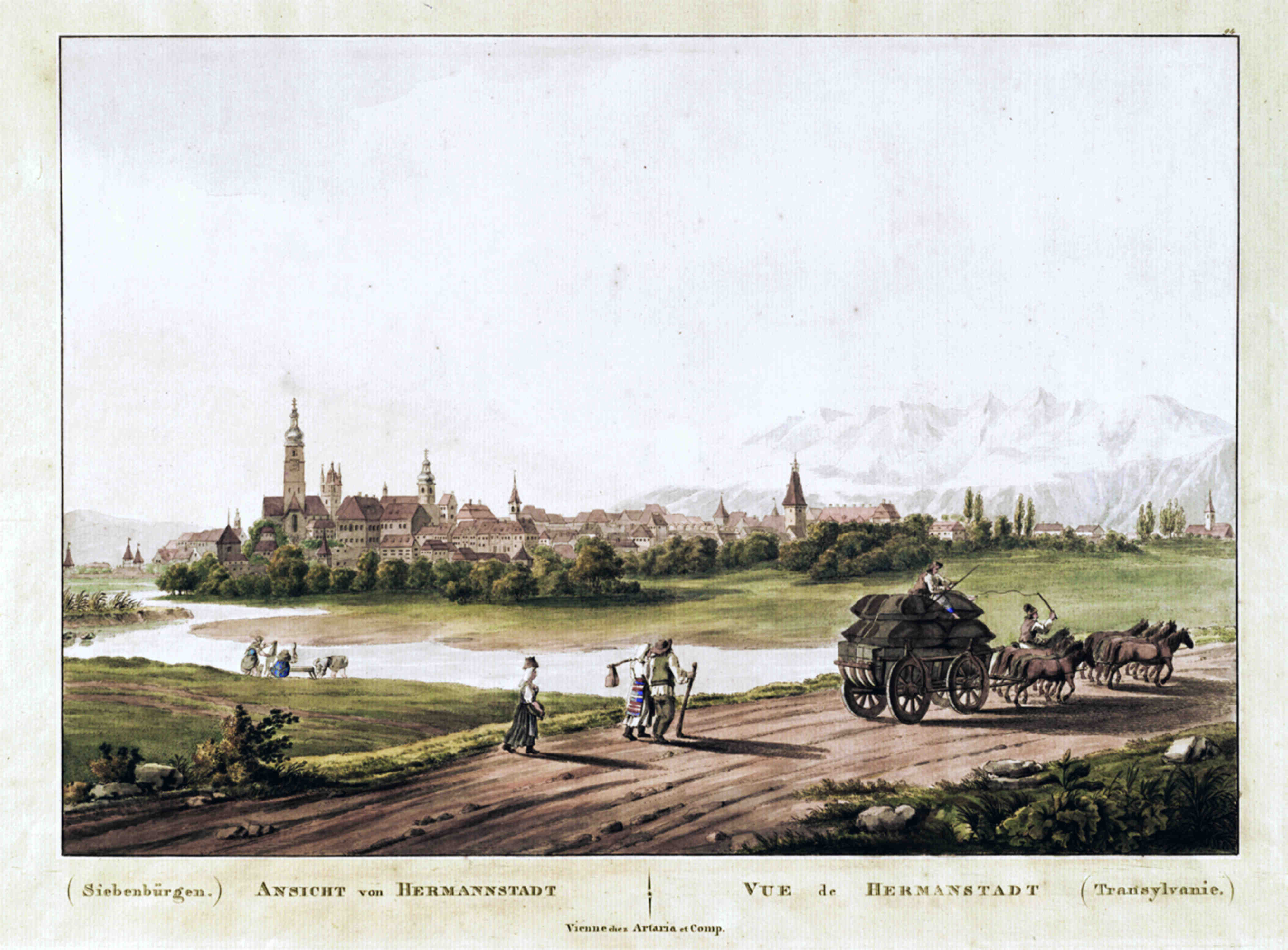 Peisaj panoramic al orașului Sibiu pictat 1816 în technica acuarelei de Franz Neuhauser cel Tânăr (1763 – 1836). Tabloul este semnat in partea de jos/dreapta: „Hermansdt gegen Morgen nach der Natur gezeichnet von Fr Neuhauser 1816“. (sursă ilustrații: arhiva Alt-Hermannstadt)