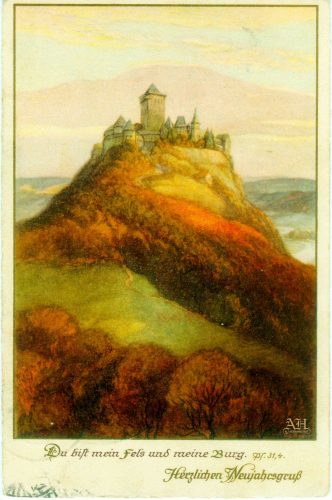 Inscripția sub ilustrație: „(Denn) Du bist mein Fels und meine Burg“ Psalm 31,3 // „(Căci) Tu eşti stânca mea, cetăţuia mea“ psalmul 31,3 -