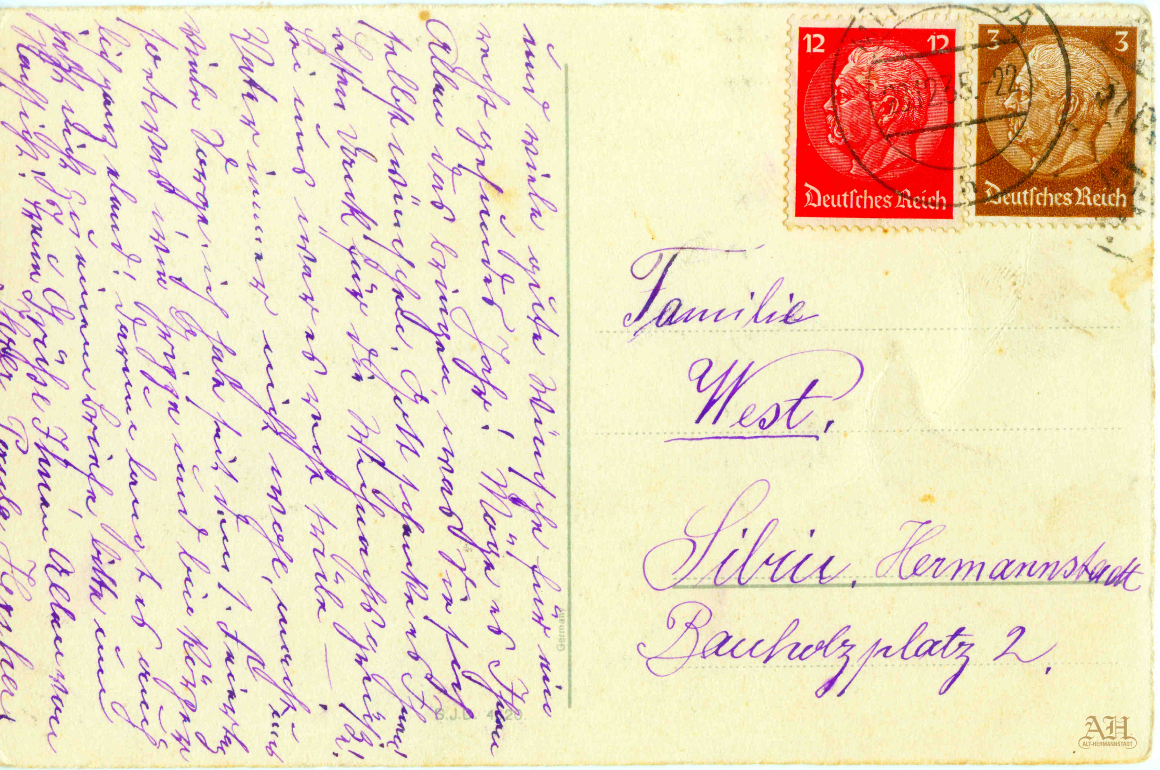 Carte poștală cu ștampila 23 decembrie 1935, adrestată familiei West, domiciliată în Sibiu, Bauholzplatz (Piața Lemnelor / Piața Cibin) nr 2.
