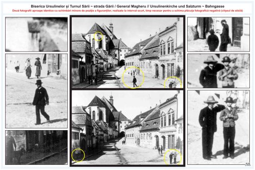 Colajul „Biserica Ursulinelor și Turnul Sării ~ strada Gării / General Magheru // Ursulinenkirche und Salzturm ~ Bahngasse” a fost realizat cu ajutorul a două fotografii aproape identice (cu schimbări minore de poziţie a figuranților) realizate la interval scurt, timp necesar pentru a schima plăcuța fotografică negativă /clișeul de sticlă.
