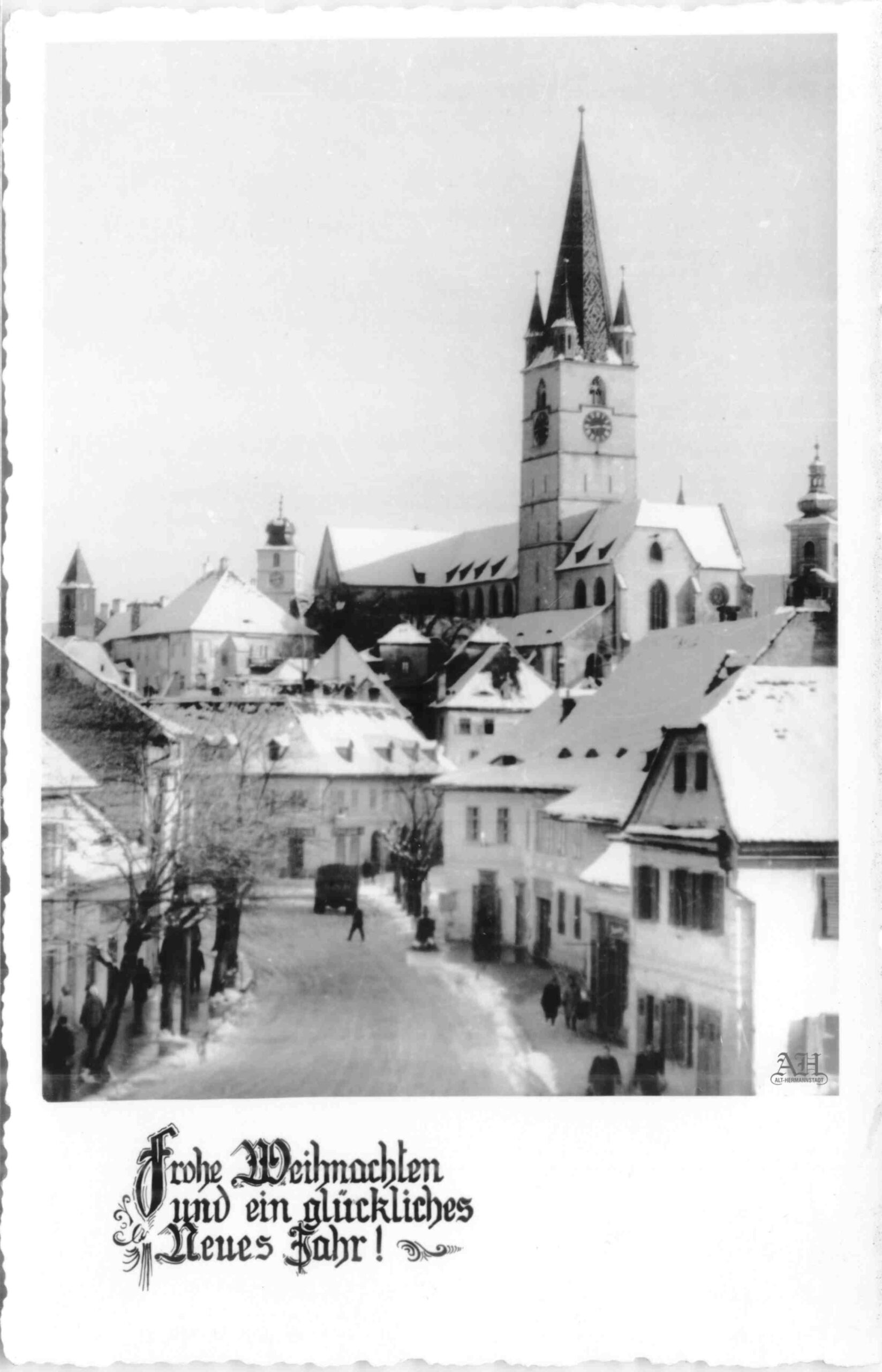 Felicitare fotografică de Crăciu din anii 1960. Fotografia arată strada Turnului // Saggasse // Zsák utca, turla bisericii Azilului, Turnul Sfatului, Bisericii Evanghelice și turla bisericii Catolice din Sibiu într-o zi însorită de iarnă. Sub fotografie se află caligrafia scrisă cu peniță: „Frohe Weihnachten und ein glückliches Neues Jahr!” // „Crăciun fericit și un An Nou plin de bucurie!”. Felicitarea se află în colecția privată Wolff.