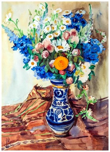 Vaza cu flori de câmp – Acuarelă realizată de Iuliana Fabritius-Dancu. I. Fabritius-Dancu a fost pictoriţă, etnografă, istoric de artă şi scriitoare de limba germană. S-a născut în 21 ianuarie 1930 la Sibiu și a decedat în 7 august 1986 la Bucureşti.