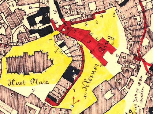 Piața Huet, Piața Mică și Complexul de clădiri lângă Podul Minciunilor descrise de Johann Böbel 1882/83 în harta orașului Sibiu, realizată de după o litografie de Robert Krabs și un desen de F. Dimitrowits din 1875.