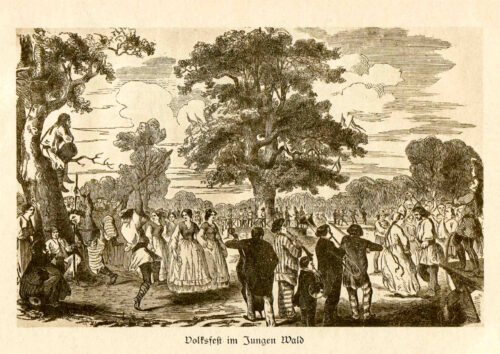 Ilustrație după o xilogravură apărută în anul 1853 în publicația „Benigni’s Volkskalender“, editată de sibianul Theodor Steinhausen, în care este ilustrată Petrecere populară dată în cinstea împăratului Franz Josef I la data de 25 iulie 1852 în Pădurea Dumbrava. Festivitatea a avut loc pe un luminiș lângă un stejar care va intra în istorie sub denumirea de Stejarul Împăratului. Timp de 29 de ani va purta numele monarhului austriac Franz Josef I pînă în anul 1881, an în care a căzut pradă unui incendiu. Această gravură a fost realizată după un desen al unui artist sibian, pictorul și fotograful Gustav Albert Schivert (1826 – 1881).