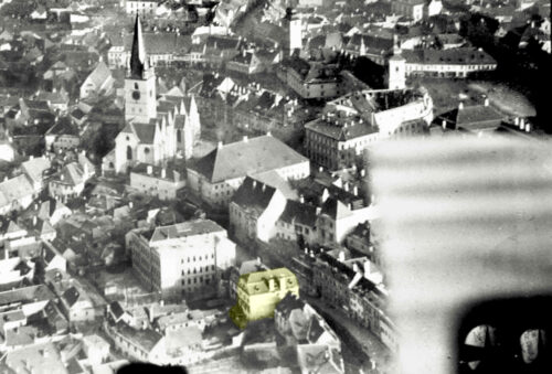 Orașul Sibiu // Hermannstadt // Nagyszeben fotografiat în luna decembrie 1917 dintr-un aeroplan. În cele două fotografii se vede casa cunoscută sub denumirea de „Casa cu lei” // „Löwengrube” marcată cu galben. Clădirile din partea sud-vestică a complexului de clădiri aflate între străzile Alexandru Odobescu // Pempflingergasse / str. Pempflinger și Moș Ion Roată // Entengasse / str. Rațelor erau deja demolate!