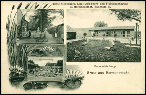 Colaj realizat cu ajutorul fotografiilor din colecția personală și arhiva grupului de Facebook Alt-Hermannstadt.La o privire mai atentă se poate observa că bazinul din poza sepia nu poate fi strandul/ bazinul din Valea Aurie de lângă Moara Schreyer amenajat 1910, deoarece în fundal lipsește pădurea Dumbrava și linia de creastă nu corespunde cu cea a munțiilor din zona Făgarașului.